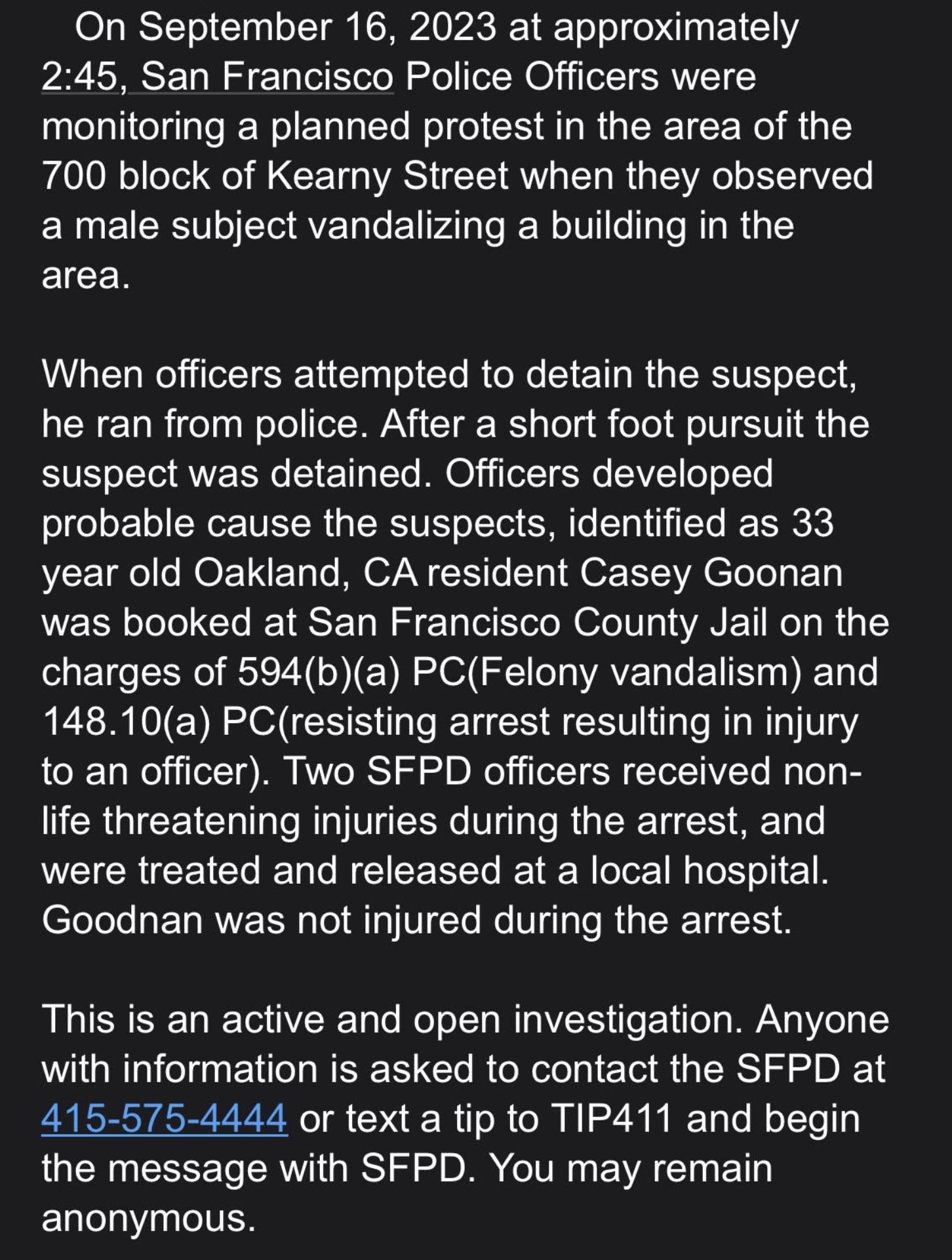 https://twitter.com/MrAndyNgo/status/1704173845794480288 https://twitter.com/MrAndyNgo/status/1703363562528289165 Casey Goonan, a 33/yo from Oakland arrested & charged with felony vandalism & resisting arrest resulting in injuring to an officer. Two SFPD officers received injuries during his alleged escape attempt. Goonan has a Ph.D. in African Studies from @NorthwesternU & is a militant prison abolitionist. He previously studied ethnic studies at UC Riverside. Event was an antifa/transtifa attacking Terf feminist. Arrested again for arson: https://www.berkeleyscanner.com/2024/06/18/uc-berkeley-crime/uc-berkeley-arson-attacks-man-arrested/