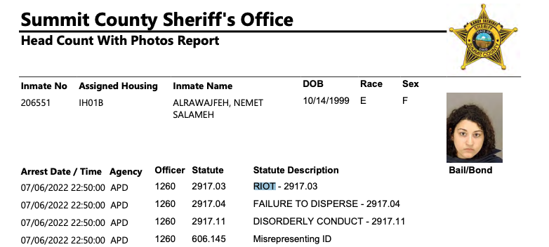Arrested during Akron BLM riots. 07/06/2022 22:50:00 APD 1260 2917.03 RIOT - 2917.03 07/06/2022 22:50:00 APD 1260 2917.04 FAILURE TO DISPERSE - 2917.04 07/06/2022 22:50:00 APD 1260 2917.11 DISORDERLY CONDUCT - 2917.11 07/06/2022 22:50:00 APD 1260 606.145 Misrepresenting ID
