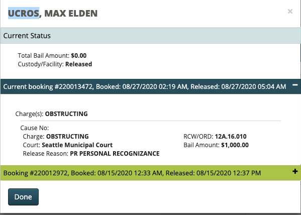 Arrested and charged with OBSTRUCTING for 8/26 Seattle Riots.