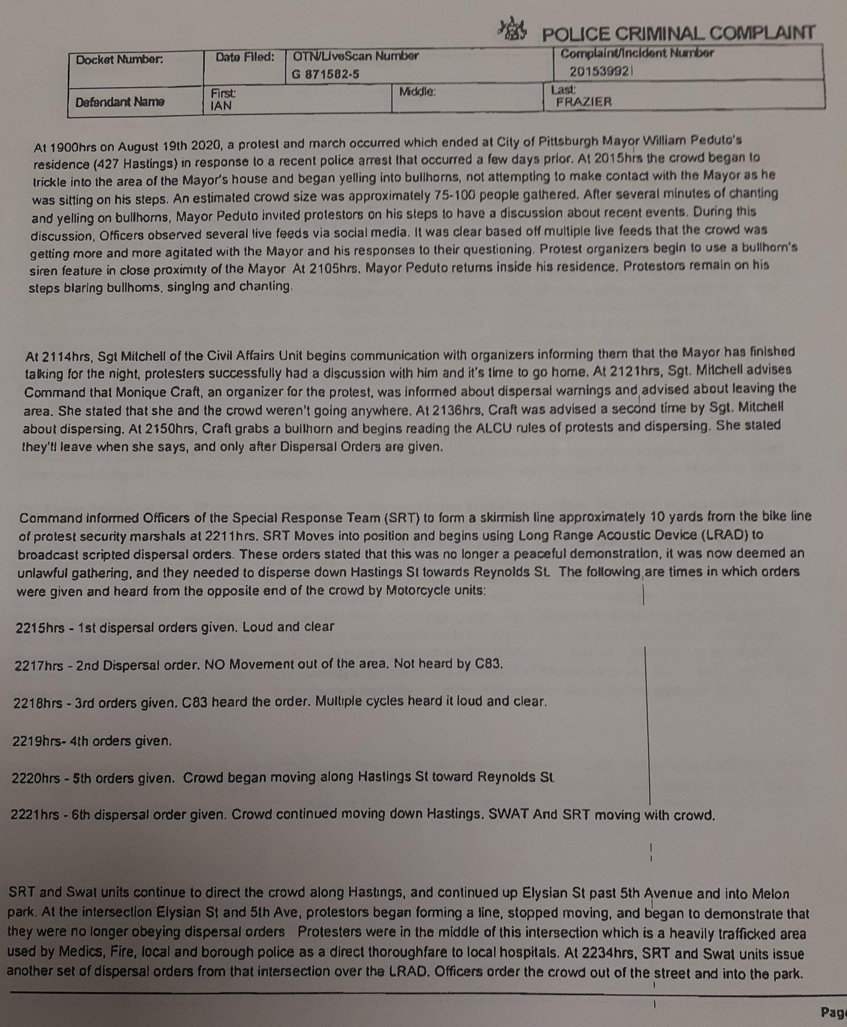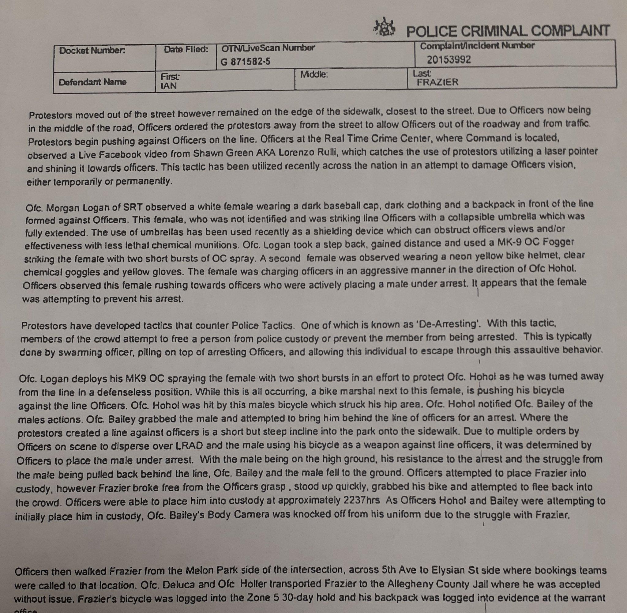 Arrested during last night's protest in Pittsburgh. They were removed from in front of the Mayor's home for causing a disturbance twice in the past two days. Protesters are upset because a fellow protester - Michael Cartier was arrested after he refused to stop blocking a major intersection used by EMS and hospital staff. Charged with Resisting arrest, Failure to Disperse, Aggravated Assault, Riot, Disorderly Conduct.