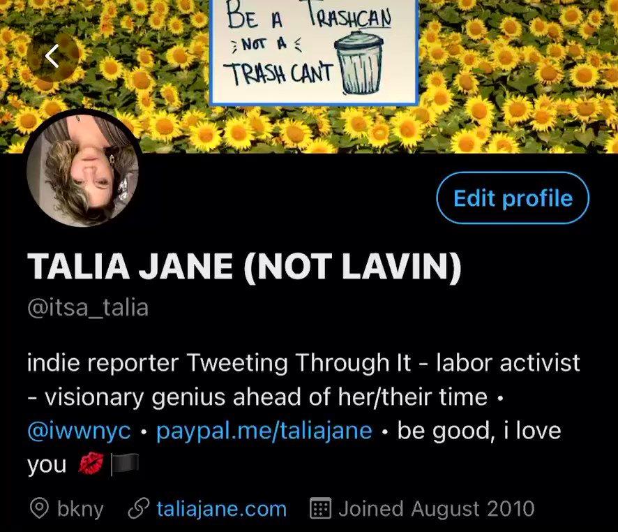 a NYC based Antifa journo. Allegedly active with "The Base" an anarcho-terrorist group that has called for violent attacks https://en.wikipedia.org/wiki/Talia_Jane https://twitter.com/mxtaliajane