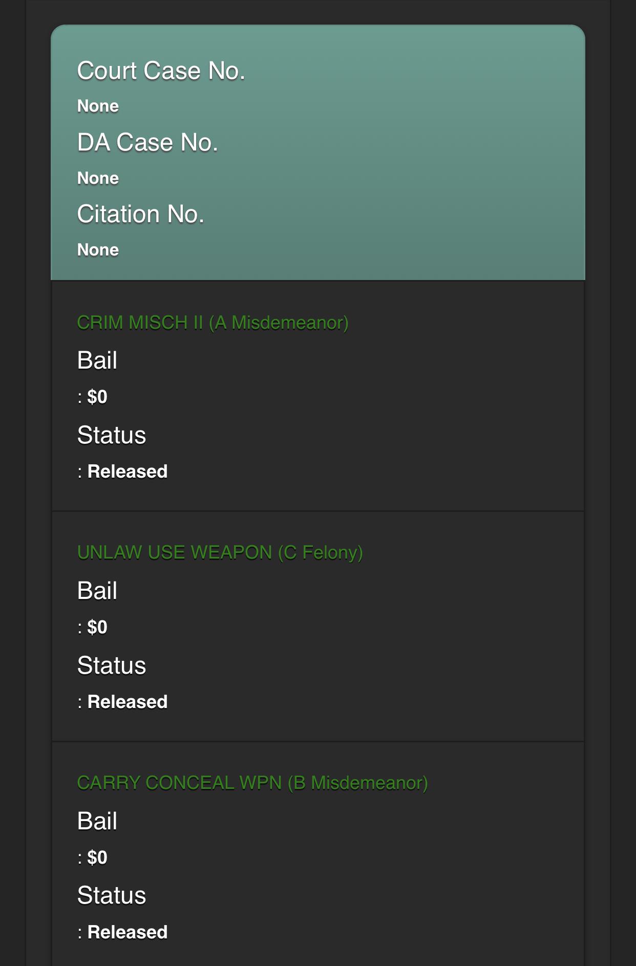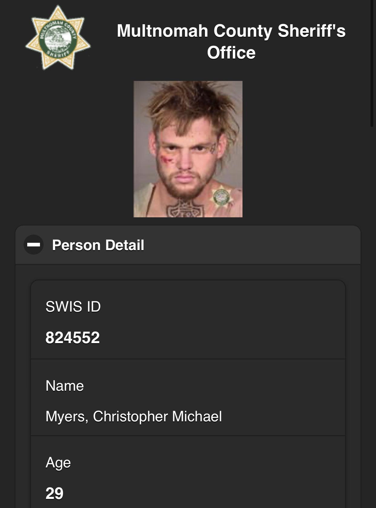 * Chris Myers, 28 years-old, Escape III, Interfering With a Police Officer, Criminal Mischief II, Unlawful Use of A Weapon, Carry Concealed Weapon, Riot, Reckless Burning https://www.portlandoregon.gov/police/news/read.cfm?id=250932 https://www.mcso.us/PAID/Home/Booking/1505390