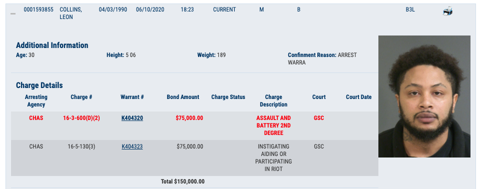 https://www.counton2.com/news/local-news/charleston-county-news/cpd-riot-related-arrests-continue/ https://www.charleston-sc.gov/riot-arrests Leon Collins (20 years old, Summerville) 1 Charge (Bond - To Be Determined) - Assault & Battery 2nd Degree (on a Law Enforcement Officer) INSTIGATING AIDING OR PARTICIPATING IN RIOT