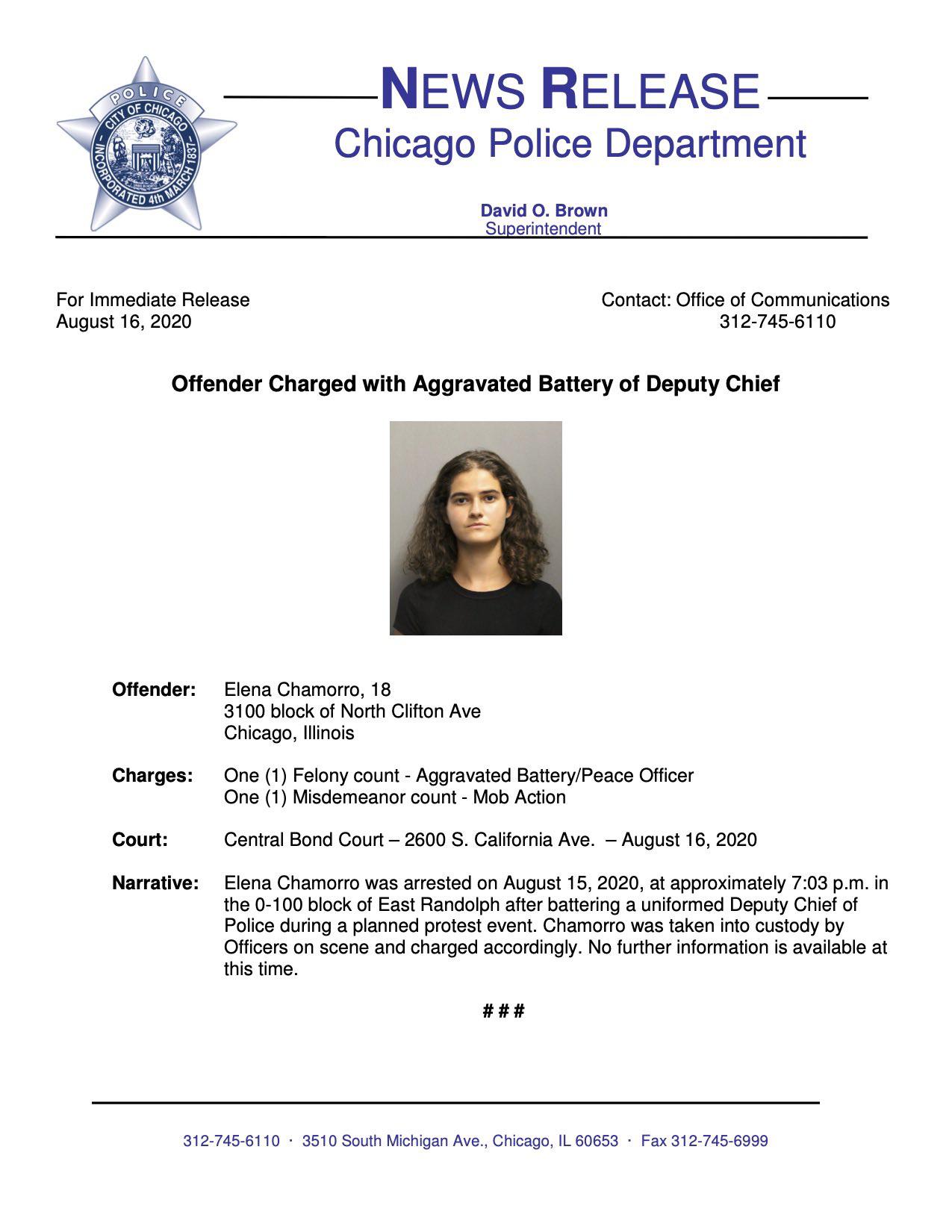 Elena Chamorro, 18, is charged with felony aggravated battery against an officer and misdemeanor mob action at the Chicago riot yesterday. #BlackLivesMatter https://twitter.com/MrAndyNgo/status/1295106693819330561