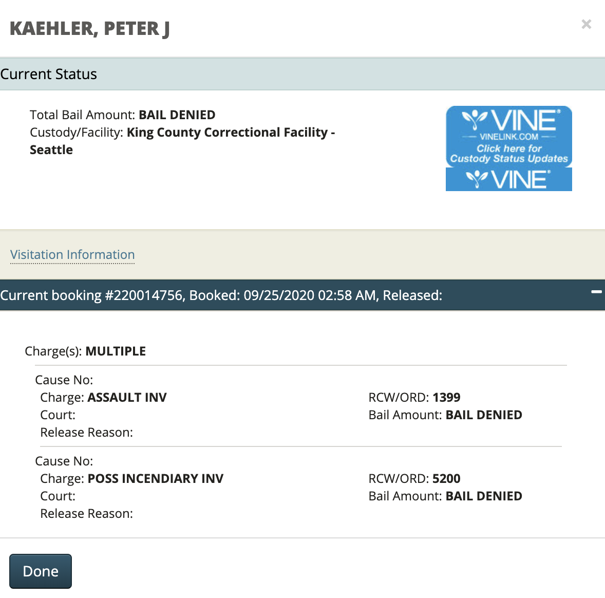 Charge: ASSAULT INV Charge: POSS INCENDIARY INV SEATTLE 9'25