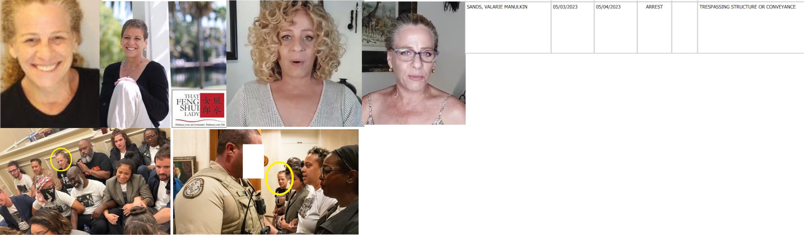 Valerie Manulkin Sands (born Oct. '67) participated in a May 2023 insurrection at the Florida state capitol where rioters occupied Governor DeSantis' office. She was arrested for trespassing. She works as a photographer and feng shui consultant. Sands lives in an apartment in Fort Lauderdale. https://web.archive.org/web/2/https://www.leoncountyso.com/portals/0/BookingReports/lcso_daily_booking_report_05042023.pdf