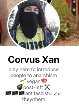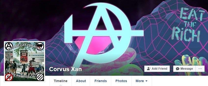https://archive.vn/c1XPF#selection-1293.0-1298.0 RAVEN XAN MORGAN aka CORVUS XAN Raven Xan Morgan aka Corvus Xan is a non-binary aspiring electronic dance music artist from McMinnville, TN who burns American flags. He is also known as The Anarcho Raver on Facebook, Tumblr and Twitter