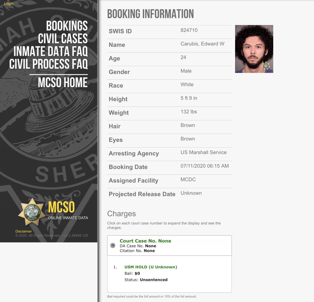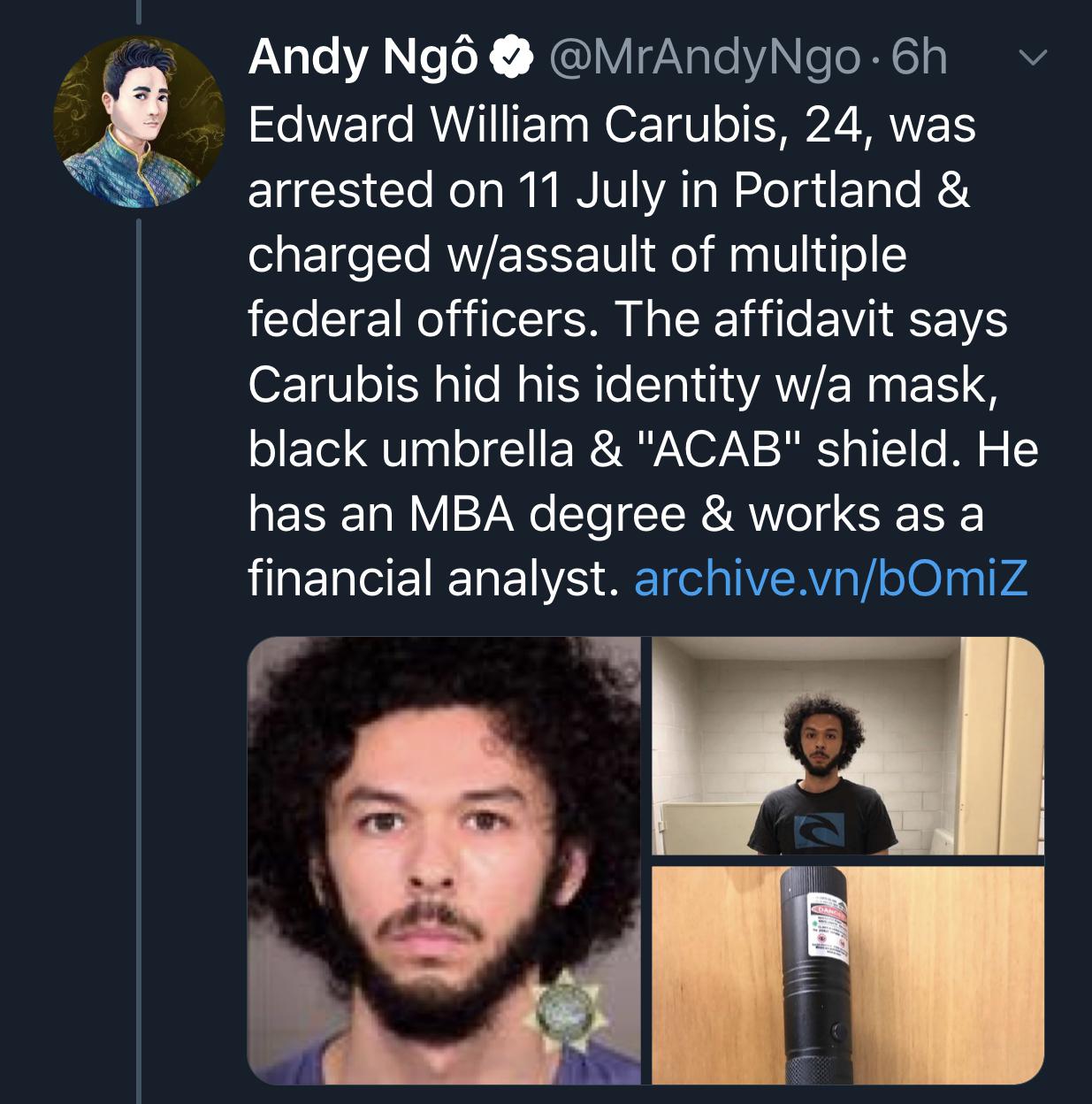 https://twitter.com/MrAndyNgo/status/1285668039212568578 Edward William Carubis, 24, was arrested on 11 July in Portland & charged w/assault of multiple federal officers. The affidavit says Carubis hid his identity w/a mask, black umbrella & "ACAB" shield. He has an MBA degree & works as a financial analyst. http://archive.vn/bOmiZ https://www.courtlistener.com/docket/17346041/united-states-v-carubis/