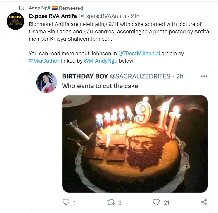 https://www.wtvr.com/news/local-news/protesters-gather-outside-richmond-councilwomans-home-again Knisya Johnson, according to police, was charged with assault on a law enforcement officer. In 2022, she attended an Antifa 9/11 "birthday party" that featured a cake with Bind Laden's face and showed the Muslim terrorist piloted planes flying into the twin towers. She lives in a dumpy row house near downtown Richmond. https://archive.ph/lxCae