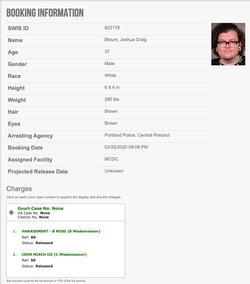 Breaking: Portland antifa activist Joshua Craig Blount, 37, was arrested and charged with harassment and criminal mischief for allegedly assaulting a videographer and breaking his camera. #AntifaMugshots https://twitter.com/MrAndyNgo/status/1232579375310131200
