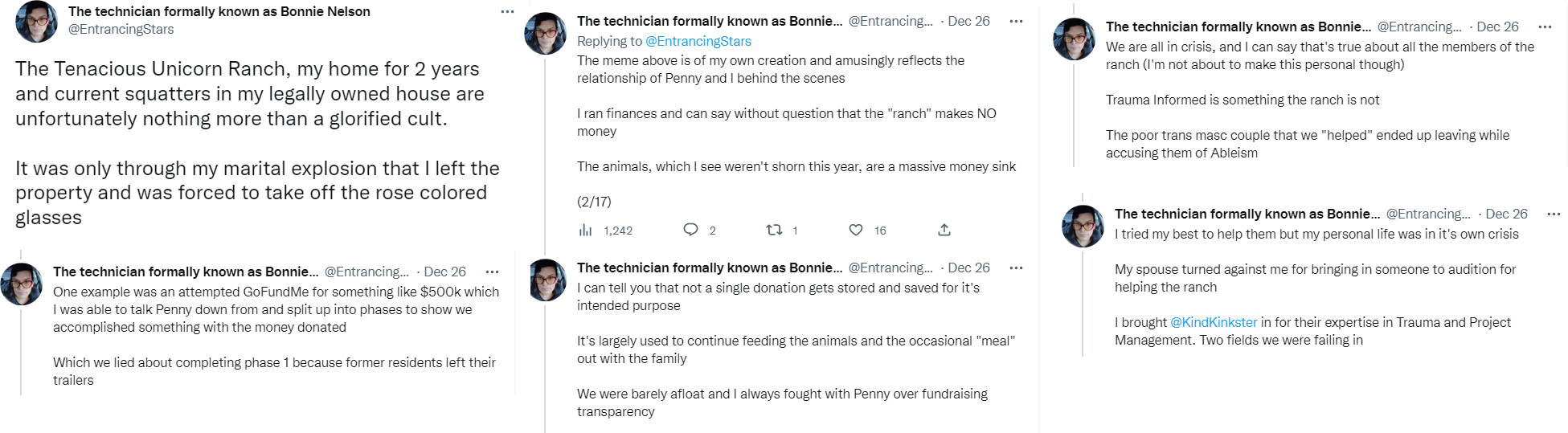 It's a M>F transgender who co-owns the Antifa affiliated Tenacious Unicorn alpaca ranch with Penellope Logue (https://antifawatch.net/ViewReport/9265d898). Nelson self-identifies as an anarchist. Nelson worked as a home health care aid in New York before it moved to Colorado to pursue its passion of farming alpacas. It uses the pronouns ey, eim and eir so please don't mis-pronoun it. Nelson has a "husband" named Sky Nelson who lives on the ranch. https://en.wikipedia.org/wiki/Tenacious_Unicorn_Ranch https://archive.ph/t9itl https://archive.ph/Cje6d It appears that all is not well at the Antifa tranny alpaca ranch. Bonnie's tranny "marriage" appears to have broken up and it left the ranch. The ranch appears to be losing a lot of money and they didn't even shear their llamas this year (See attached Tweets).