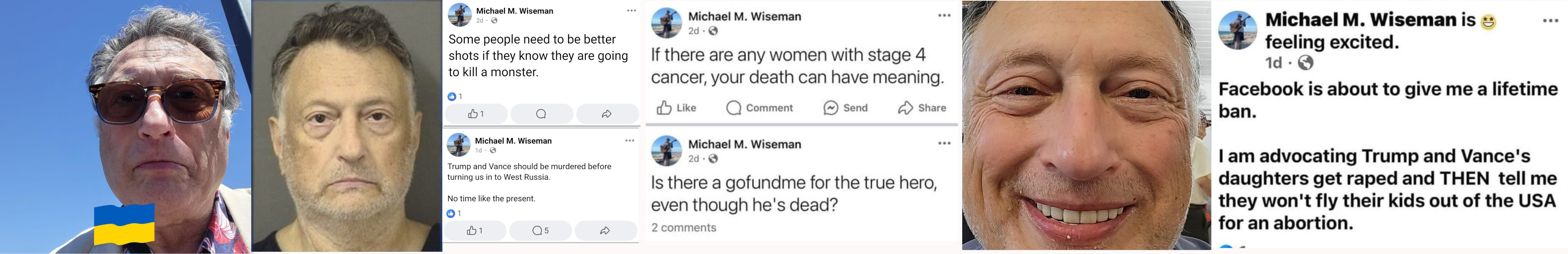 Michael Martin Wiseman (Born Jan. '56) is a left-wing geezer who was arrested in July 2024 for making death threats against Trump and J.D. Vance on Facebook after the assassination attempt against Trump. He suggested that women with stage four cancer should murder Trump because they have nothing to lose. He also advocated for the rape of Trump and Vance's daughters (Vance's kids are in elementary school). Wiseman was charged with written threats to kill. His only prior was a charge for making a false alarm. Wiseman lives in Jupiter, north of Miami. His social media accounts appear to have been deleted. https://archive.vn/mta2l Wiseman lives in Jupiter, north of Miami.