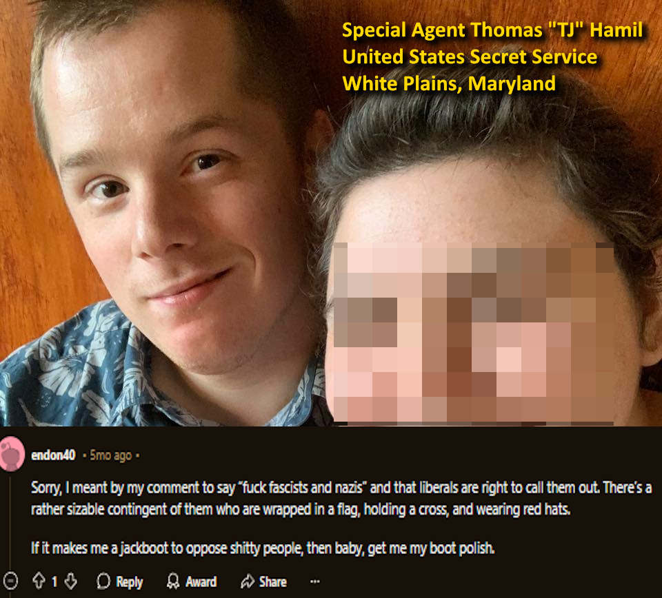 Thomas Jack "TJ" Hamil is an anti-White extremist who was radicalized by Antifascist podcasts run by Robert Evans. Although he is a lifelong leftist, Hamil would break the mold and become a St. Louis Metropolitian Police Department Cop, just in time for the 2020 Summer of Racial Reckoning. He then became a Special Agent for the United States Secret Service, and would have a meltdown on Reddit (username /u/endon40), begging other Antifa to forgive him for the unthinkable crime of being a "cop." He uses Reddit constantly to attack Trump, conservatives, White people, and all sorts of Americans he believes are enemies for the political opinion. The Justice Report was able to figure out who he was by looking through his 12-year-old account, where he had links to an old SoundCloud that had his face and full name. https://justicereport.net/2024/11/14/exclusive-trump-hating-antifa-and-online-extremist-is-a-us-secret-service-agent/ https://soundcloud.com/tjhamil https://www.linkedin.com/in/thomas-hamil