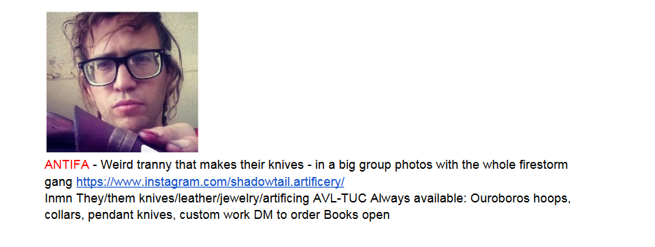 Just an unbelievably creepy dude who makes knives and thinks he is a woman. Also a former UNCA student who now travels between Asheville and Arizona.