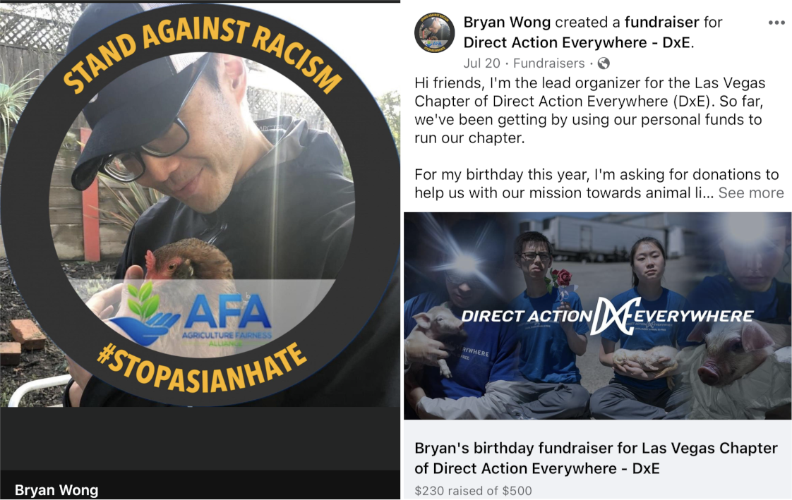He's the lead organizer for the Las Vegas chapter of the radical animal rights group Direct Action Everywhere (DxE). See pic for backup.