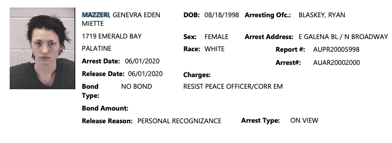 https://bloximages.newyork1.vip.townnews.com/wcsjnews.com/content/tncms/assets/v3/editorial/9/4f/94ff36a6-7328-5df3-80cb-1460aa4f6e39/5ed7bedb62a68.pdf.pdf https://www.dailyherald.com/news/20200601/six-of-17-arrested-in-sundays-aurora-riot-appear-in-bond-court Genevra E. Mazzeri, 22, of Palatine, who was accused of resisting a peace officer.