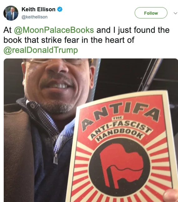 https://www.americanexperiment.org/2018/01/keith-ellison-endorses-political-violence/ https://www.snopes.com/fact-check/ellison-antifa-book/ Holding a book by Mark Bray (who frequently endorses political violence) - https://antifawatch.us/ViewReport/bddeed8f Pictured alongside Portland Antifa leader Luis Marques - https://antifawatch.us/ViewReport/4ae068d5 Even snopes has to tell the truth about him.