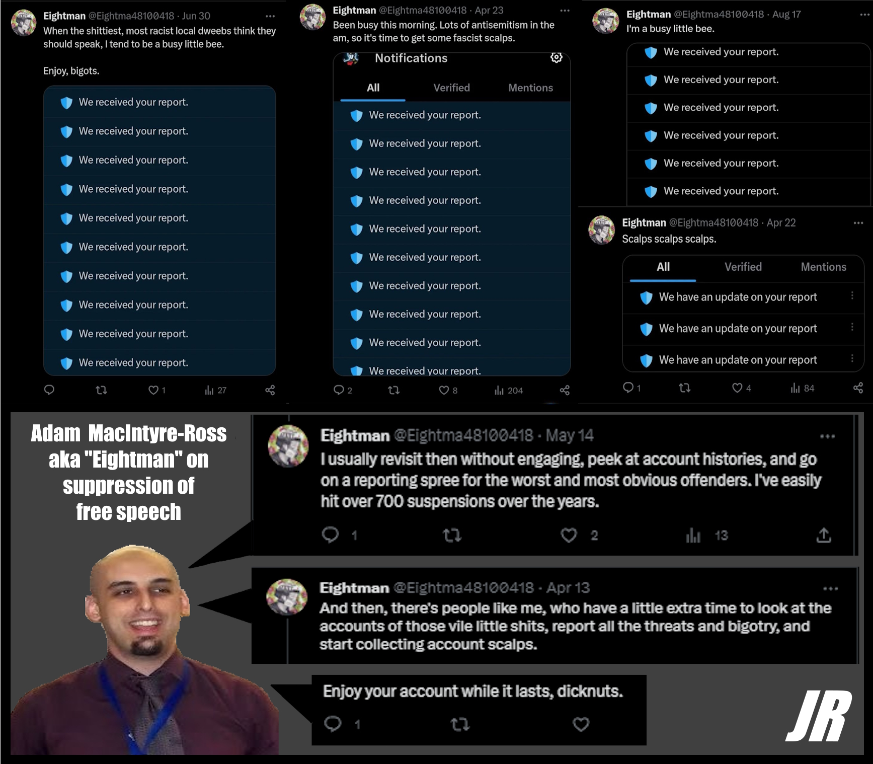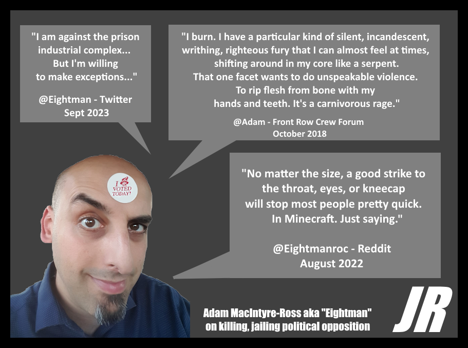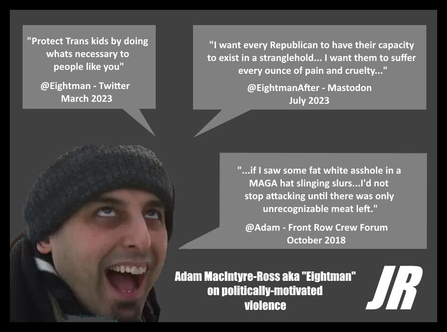 Adam MacIntyre-Ross is "Eightman" a highly online, violent, antifa organizer based out of Rochester, NY. For years he has doxed, harassed, organized protests, directed "mutual aid," and even threatened dozens of people with overt and implied acts of violence. He currently targets Mom's for Liberty, local conservative groups, Patriot Front, Trump Voters, 2nd Amendment supporters, etc, and has a prolific history of getting Twitter accounts deplatformed by working with a network of other local antifascists. His gimmick is that he wears a white/black combat helmet with an "8" on it to IRL counter protests. He currently is an admin for the Antifa subreddit /r/rochesternyactivism and has used the platform to post doxes of right-wingers. By his own admission, he attended and helped recruit/organize during the 2020 BLM riots. He was there during the George Floyd riots as well as the Daniel Prude riots later in the year. He also attended a "Drag Queen Story Hour" in support of the drag queens and has been featured in local media reports. He is currently a member/admin/leader for the American Iron Front, an Antifa group whose chats were leaked by online activists. He currently lives in Chili, NY, a predominantly White suburb, and works as a middle school art teacher for the Rochester City School District. According to the Justice Report, he should be considered extremely dangerous based on a long line of violent, deranged comments on social media. Mastodon: https://mastodon.social/@EightmanAfter Article: https://justicereport.news/articles/2023/09/21/middle-school-art-teacher-exposed-as-militant-antifa-ringleader-in-upstate-new-york/ American Iron Front Discord leaks https://wmkinstitute.com/american-iron-front-discord-server-leaked-by-patriot-youth/ Eightman at a drag story hour: https://archive.ph/GFG0c