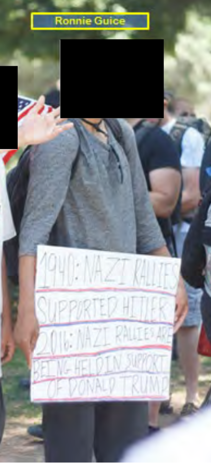 According to a 2016 criminal investigation by the California Highway Patrol recently obtained by the William McKinley Institute, Ronnie Darrel Guice "arrived at the California State Capitol to support a planned action to deny the Traditionalist Worker Party (TWP) from assembling and speaking at their event." Birthdate: 7/15/1989 https://wmkinstitute.com/chps-2000-page-report-on-2016-sacramento-capital-anti-white-antifa-terrorist-attack/ https://wmkinstitute.com/chp-helicopter-footage-of-the-2016-premeditated-anti-white-attack-in-sacramento/ https://wmkinstitute.com/the-torch-antifa-network-the-anarcho-terrorist-syndicate/ https://archive.is/Lg88C https://archive.ph/SaxdK https://archive.is/ThIEA
