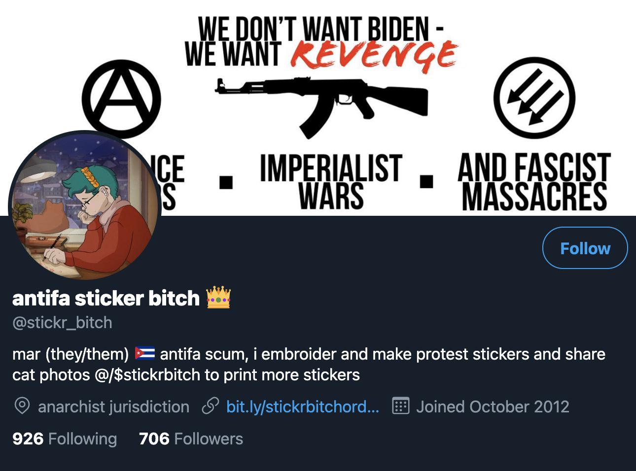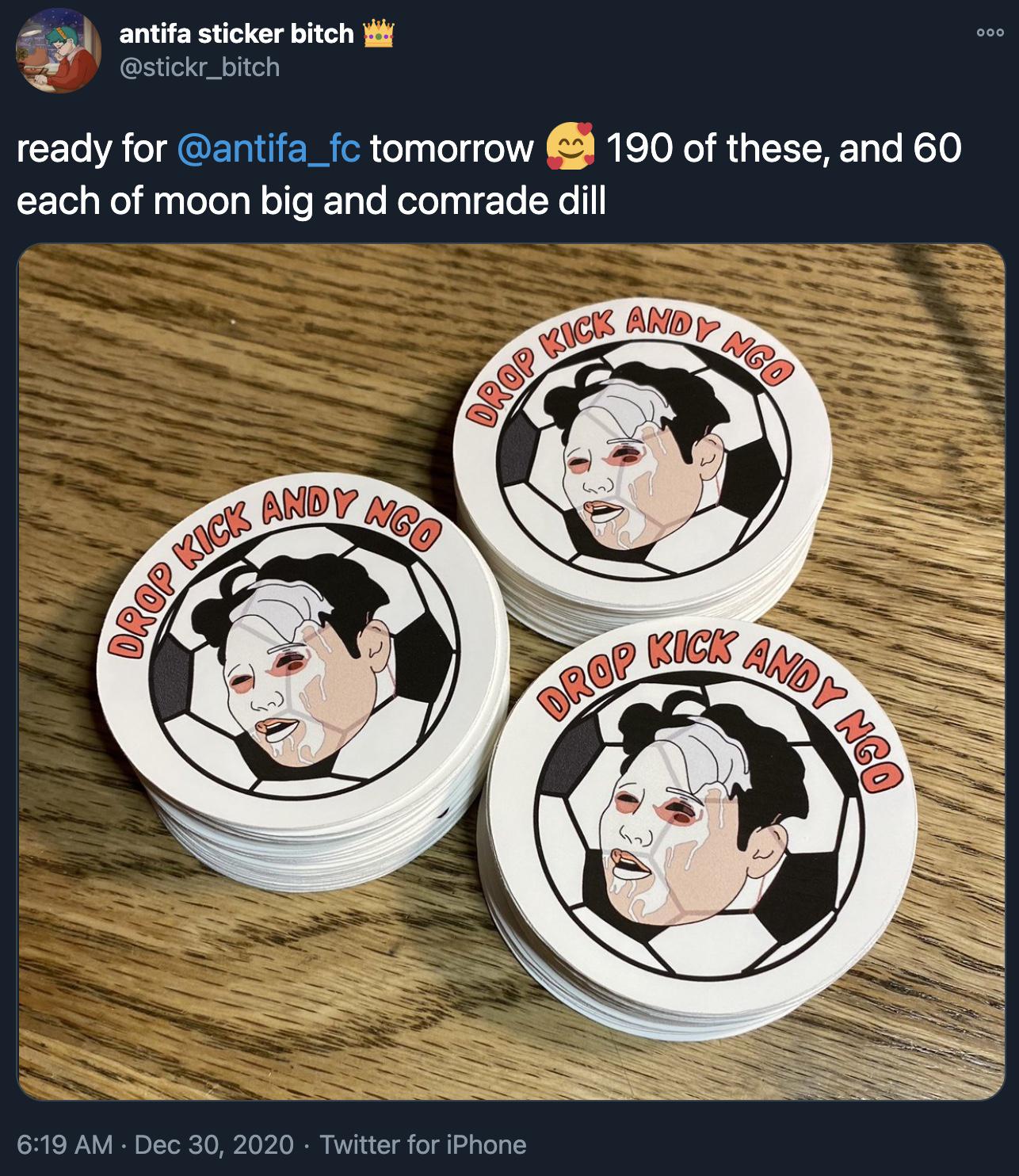 https://twitter.com/MrAndyNgo/status/1345099550453870592 Antifa have been posting stickers around Portland showing my injured face w/the text: "DROP KICK ANDY NGO." The propaganda art that incites violence against me is created by antifa member Marisol Nora Beck. The 25 year-old uses the moniker "Antifa Sticker Bitch" to hide identity.
