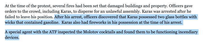 At the time of the protest, several fires had been set that damaged buildings and property. Officers gave orders to the crowd, including Karas, to disperse for an unlawful assembly. Karas was arrested after he failed to leave his position. After his arrest, officers discovered that Karas possessed two glass bottles with wicks that contained gasoline. Karas also had fireworks in his possession at the time of his arrest. A special agent with the ATF inspected the Molotov cocktails and found them to be functioning incendiary devices. Federal Charges Charged with possessing incendiary devices known as Molotov cocktails at a protest that began on May 30th in La Mesa. https://www.justice.gov/usao-sdca/pr/man-charged-possessing-molotov-cocktails-la-mesa-protest AND LIKE CLOCKWORK, makes a gofundme, plays the victim, and doesn't mention the molotovs, LOL https://www.gofundme.com/f/help-zak-get-a-lawyer Update: It appears that GoFundMe is giving money to his campaign as well. https://www.courtlistener.com/docket/17326059/united-states-v-karas/