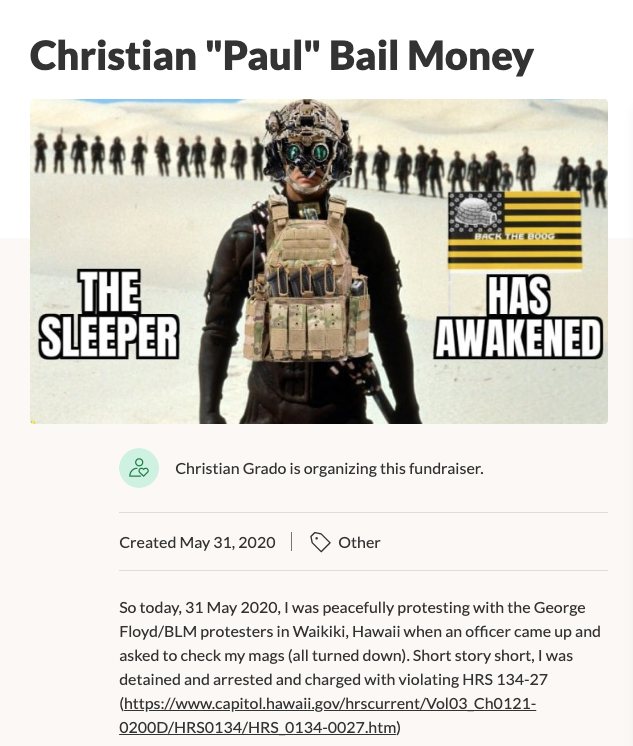 https://www.hawaiinewsnow.com/2020/10/07/waikiki-man-charged-bizarre-email-bomb-cyber-attack-targeting-hpd/ https://www.gofundme.com/f/christian-quotpaulquot-bail-money A BLM boog - arrested and charged with violating HRS 134-27 (ammunition offense) on May 31st Arrested and charged with violating HRS 134-2