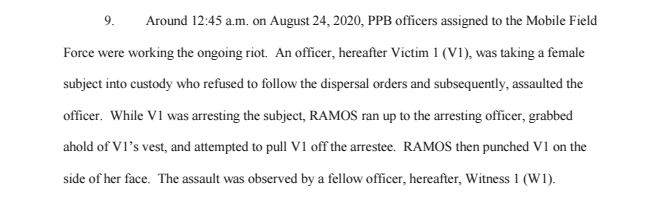 https://www.portlandoregon.gov/police/news/read.cfm?id=261131&ec=2&ch=twitter Ramos, Pedro, 20, of Hillsboro, Assaulting a Public Safety Officer, Riot, Interfering with a Peace Officer Charged Federally - https://www.justice.gov/usao-or/pr/three-portlanders-charged-civil-disorder-after-assaulting-local-police-officers https://www.courtlistener.com/docket/18425700/united-states-v-ramos-jr/