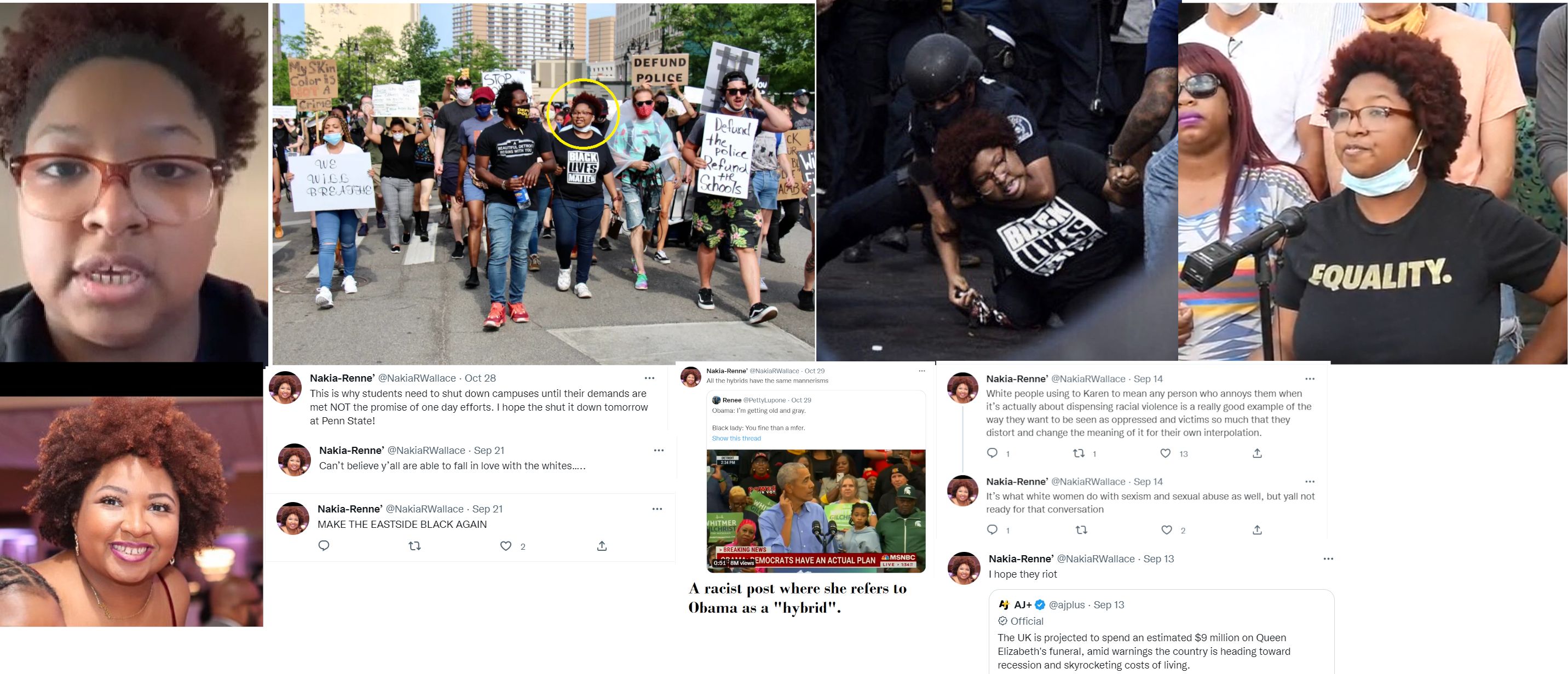 Nakia Renea Duprea Wallace (DOB: 12/16/96) is a leader and co-founder of the BLM aligned protest group Detroit Will Breathe. Wallace was arrested at a violent BLM protest in Detroit in 2020. Police had to put her in a chokehold to subdue her and BLM activists later made a big deal about the use of the chokehold. She appears to have had her charges dismissed. In an interview, Wallace refused to condemn violence at BLM protests. Her Twitter feed is filled with racist Tweets. She has a B.A. in African American studies and works for a non-profit. Wallace lives in an apartment in Detroit. https://archive.ph/fuysj https://www.courthousenews.com/wp-content/uploads/2020/08/detroit-protests.pdf https://www.linkedin.com/in/nakia-wallace-791627b1