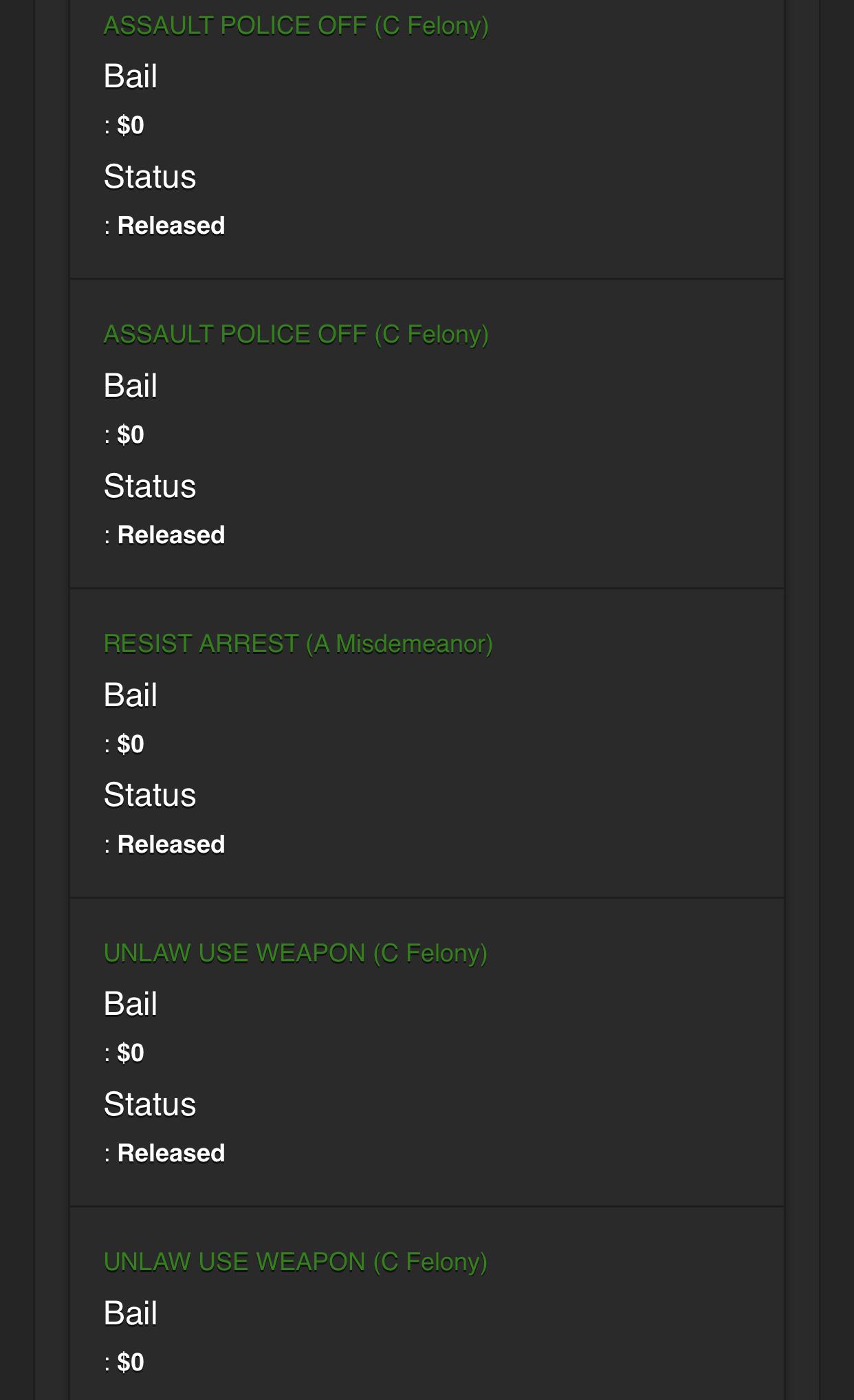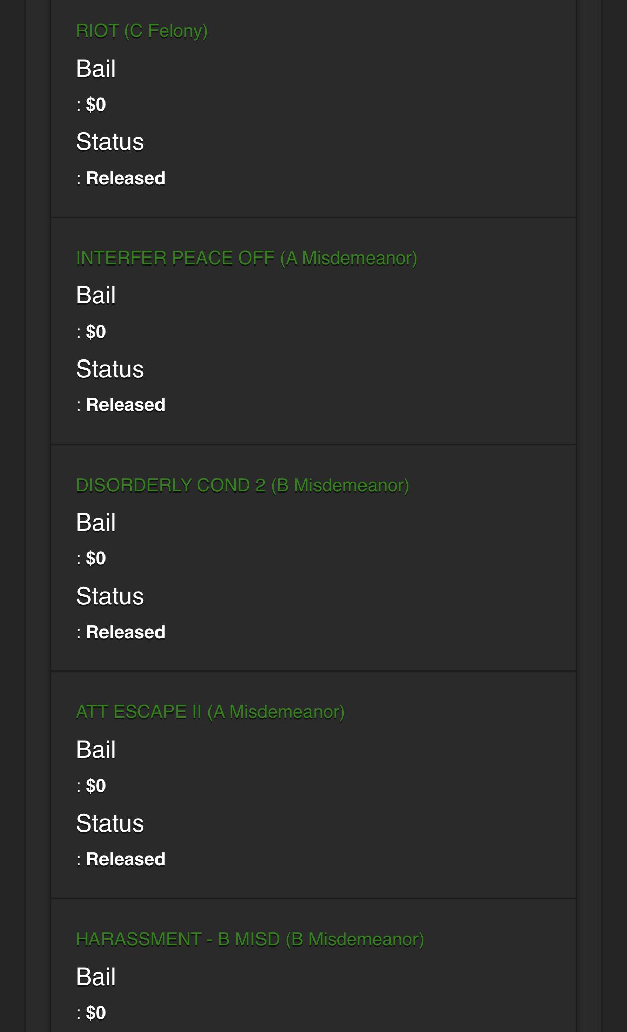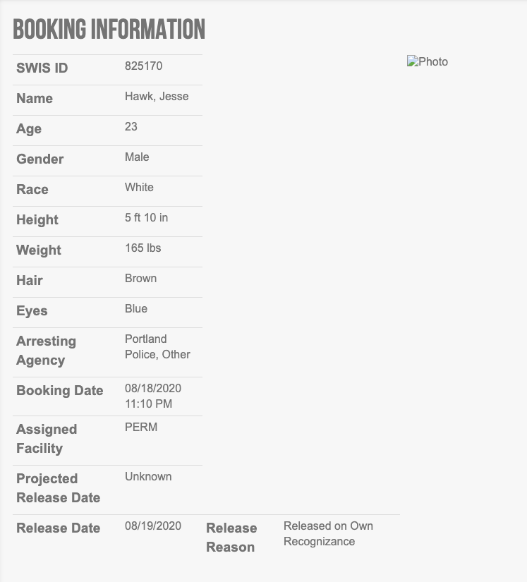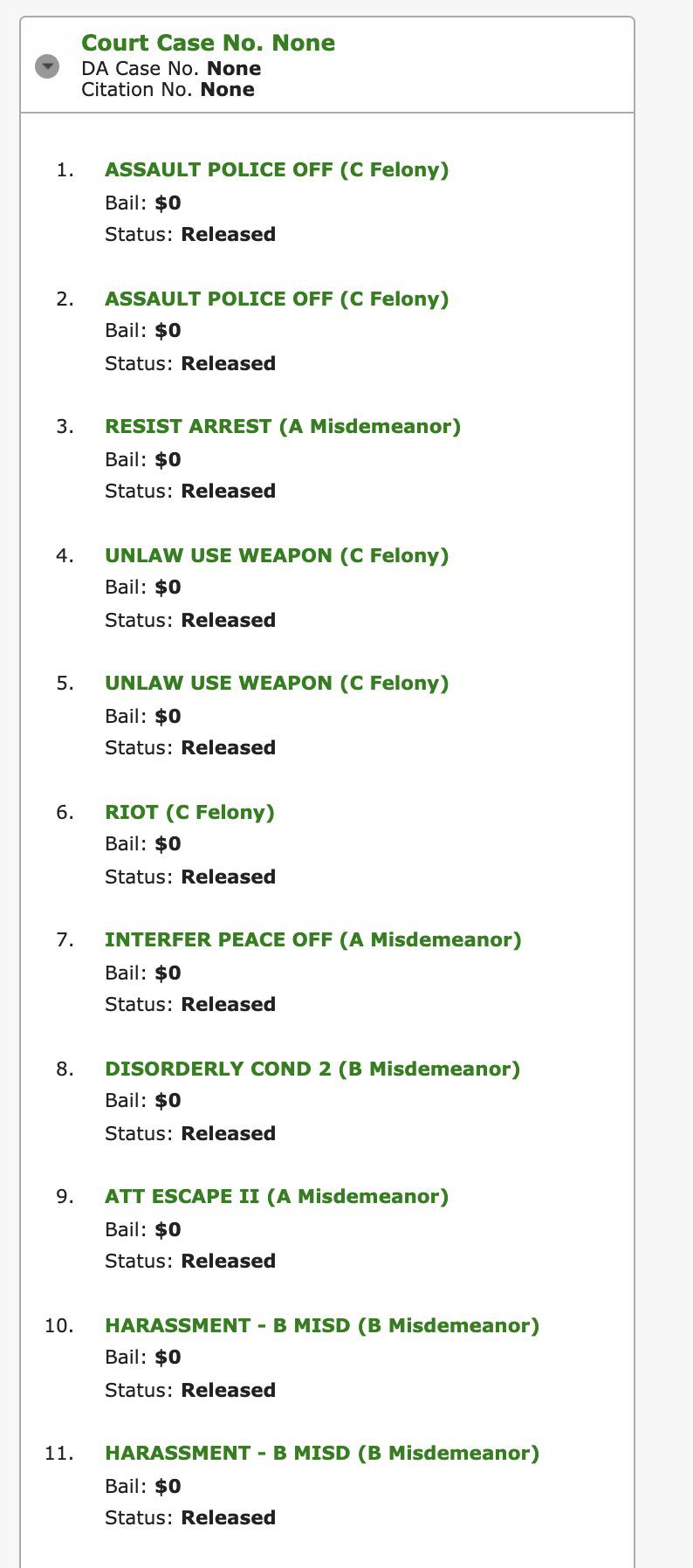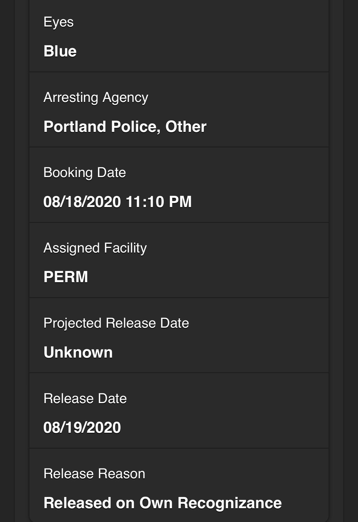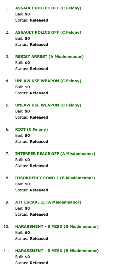 https://www.portlandoregon.gov/police/news/read.cfm?id=261110 http://www.mcso.us/PAID/Home/Booking/1507095 ASSAULT POLICE OFF (C Felony) ASSAULT POLICE OFF (C Felony) RESIST ARREST (A Misdemeanor) UNLAW USE WEAPON (C Felony) UNLAW USE WEAPON (C Felony) RIOT (C Felony) INTERFER PEACE OFF (A Misdemeanor) DISORDERLY COND 2 (B Misdemeanor) ATT ESCAPE II (A Misdemeanor) HARASSMENT - B MISD (B Misdemeanor) HARASSMENT - B MISD (B Misdemeanor)