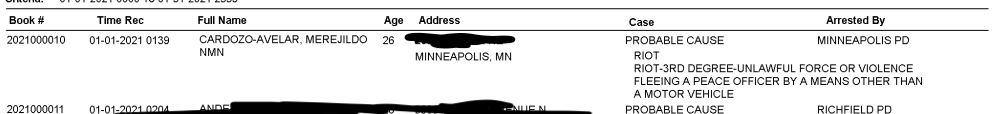 Arrested as part of the 2021 New Years Minneapolis 'jail support' riot. Pic of arrest log attached