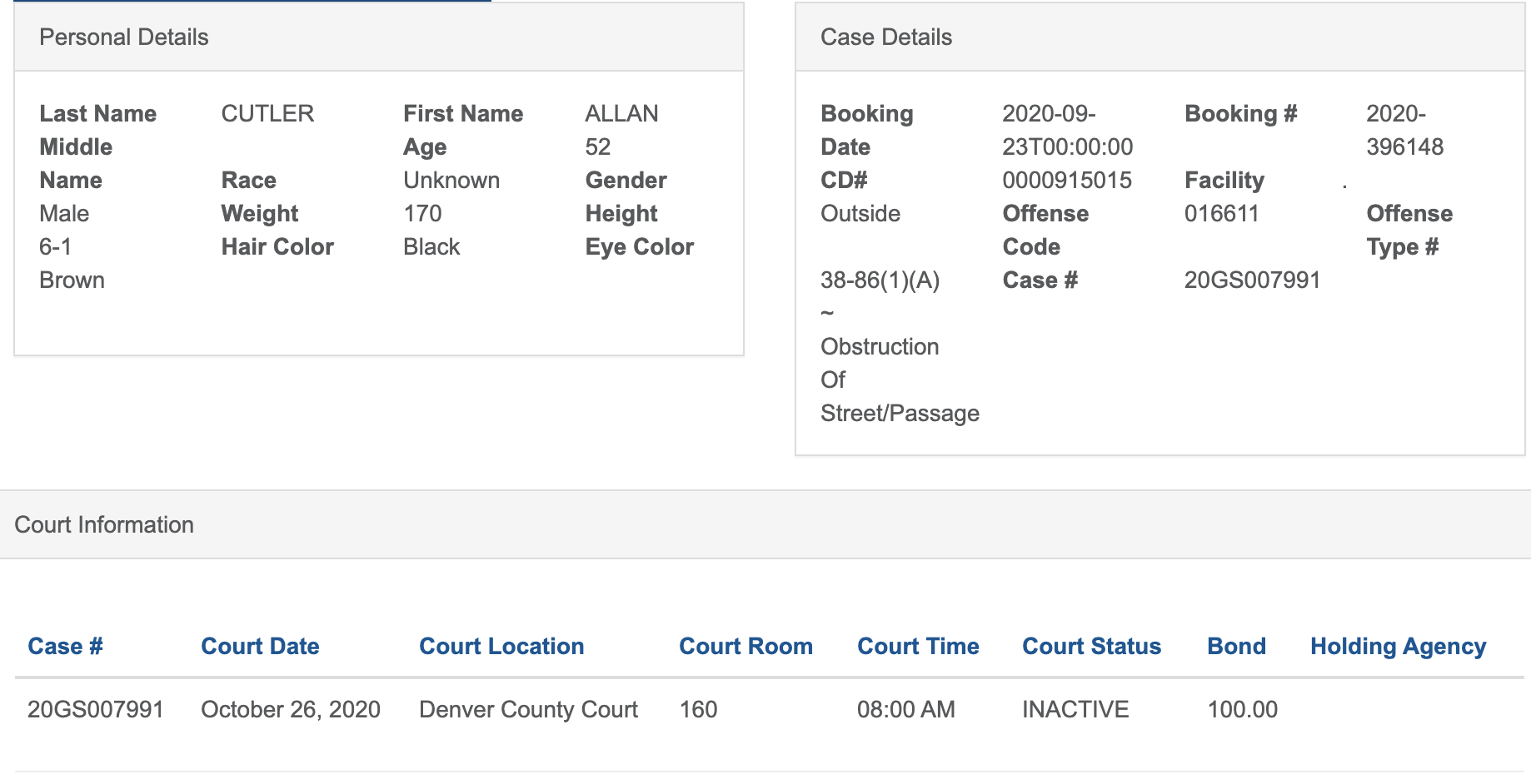https://www.9news.com/article/news/crime/denver-breonna-taylor-protests-arrests/73-3843e873-babd-469a-9248-f065702e3aed https://www.facebook.com/allan.cutler1 Allan Cutler, 52, who was arrested for investigation of obstruction of a street.