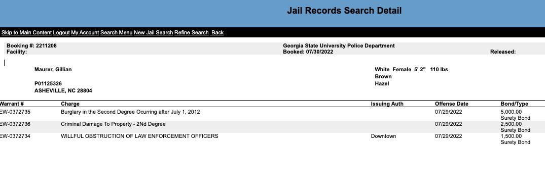 https://twitter.com/AntifaWatch2/status/1554282610511192064 https://twitter.com/UR_Ninja/status/1553581282281418753 Arrested for burglary, vandalism, and obstruction at GSU in Atlanta as a part of a 'Stop cop city' direct action targeting a worksite of the general contractor Full name: Gillian Rose Maurer, DOB: 12/12/98. She worked as a street medic at a violent June 2020 George Floyd protest in Asheville. She's an artist. Her last known address as of 2021 was in Weaverville, north of Asheville. https://archive.ph/xpW2a#selection-1029.0-1029.14 https://m.facebook.com/gillianrosem/ Incident Report https://wmkinstitute.com/police-incident-report-seven-arrested-for-property-destruction-at-georgia-state-university/