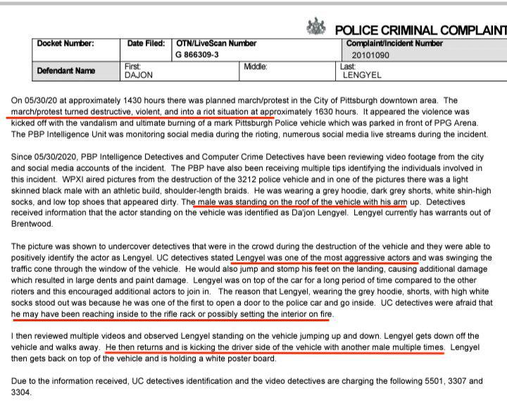 https://pittsburgh.cbslocal.com/2020/06/08/man-arrested-for-alleged-role-in-downtown-pittsburgh-riots/ The sheriff’s office says he was identified as the man standing on Pittsburgh police car that was spray-painted and burned. Tons of priors. Officials say Lengyel had a criminal bench warrant for a domestic violence incident. He failed to appear in court and forfeited his bond last June. Also a bit of witness intimidation https://allegheny.crimewatchpa.com/brentwoodboropd/17167/warrants/lengyel-dajon-n-4952-a1-intimidation-witnesses-or-victims-m2