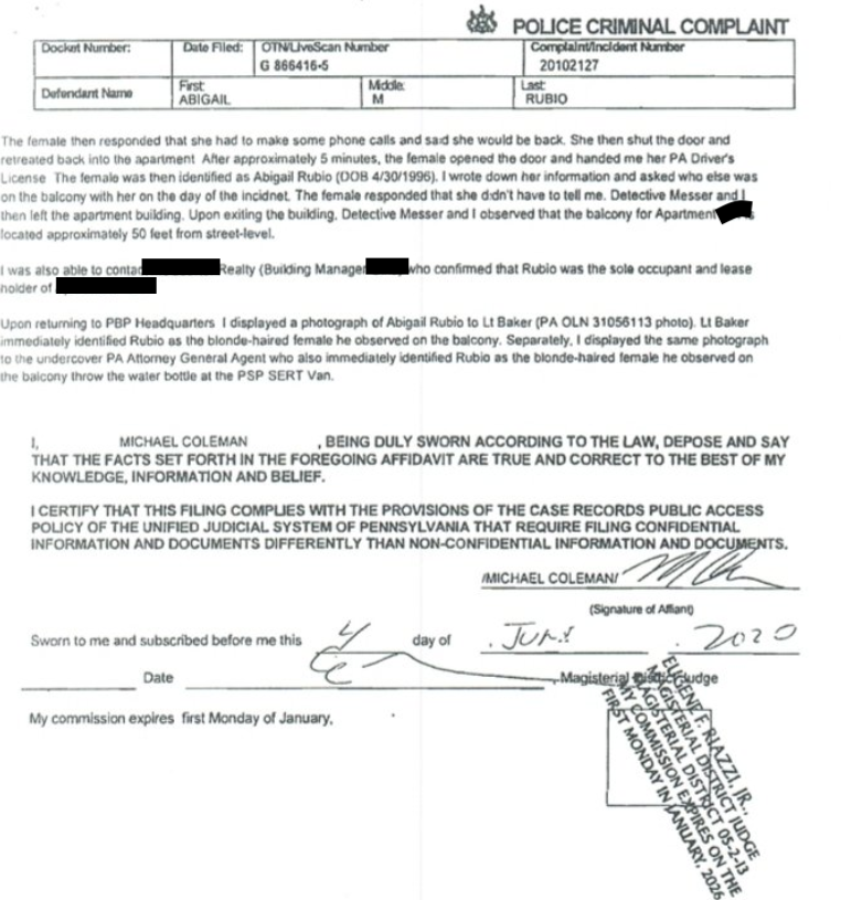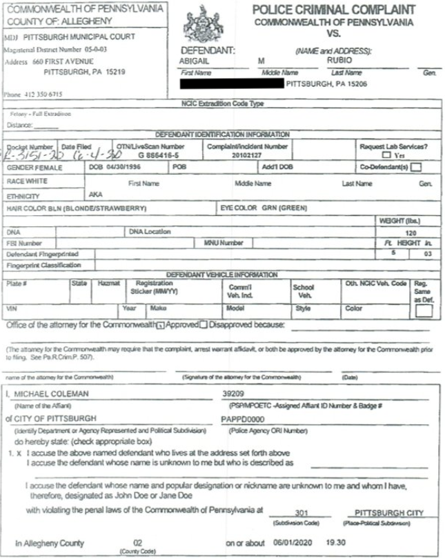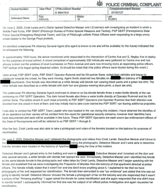 Abigail Rubio according to police threw a projectile at police during a riot in Pittsburgh