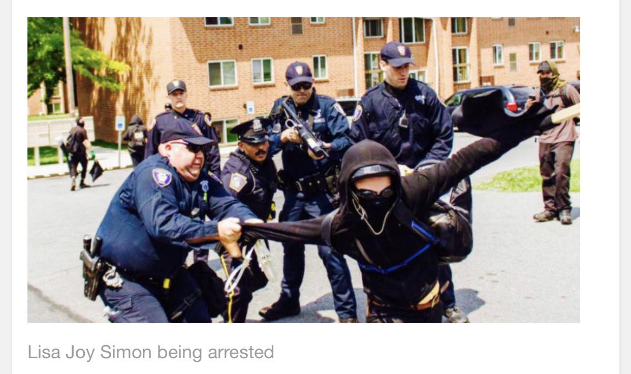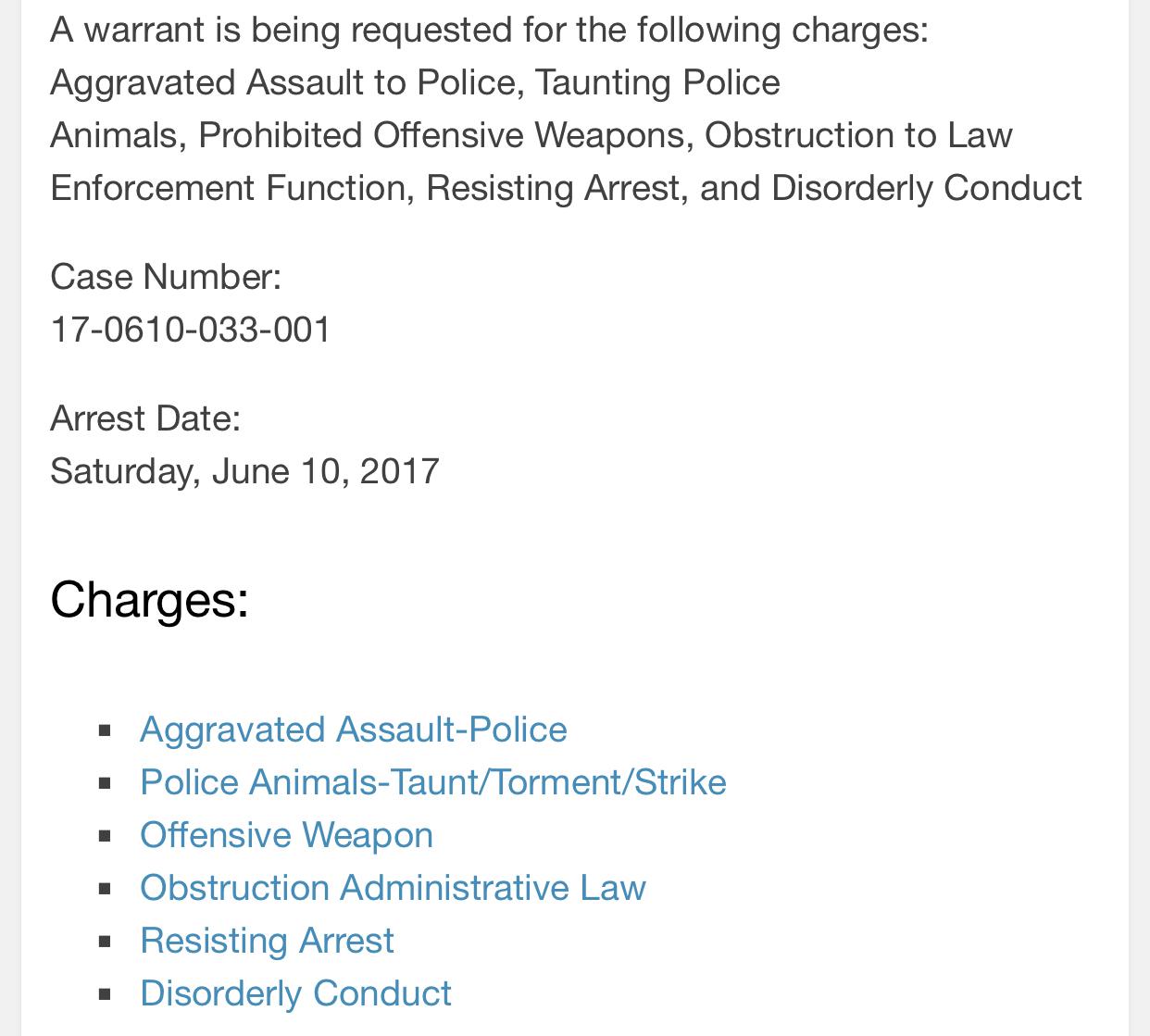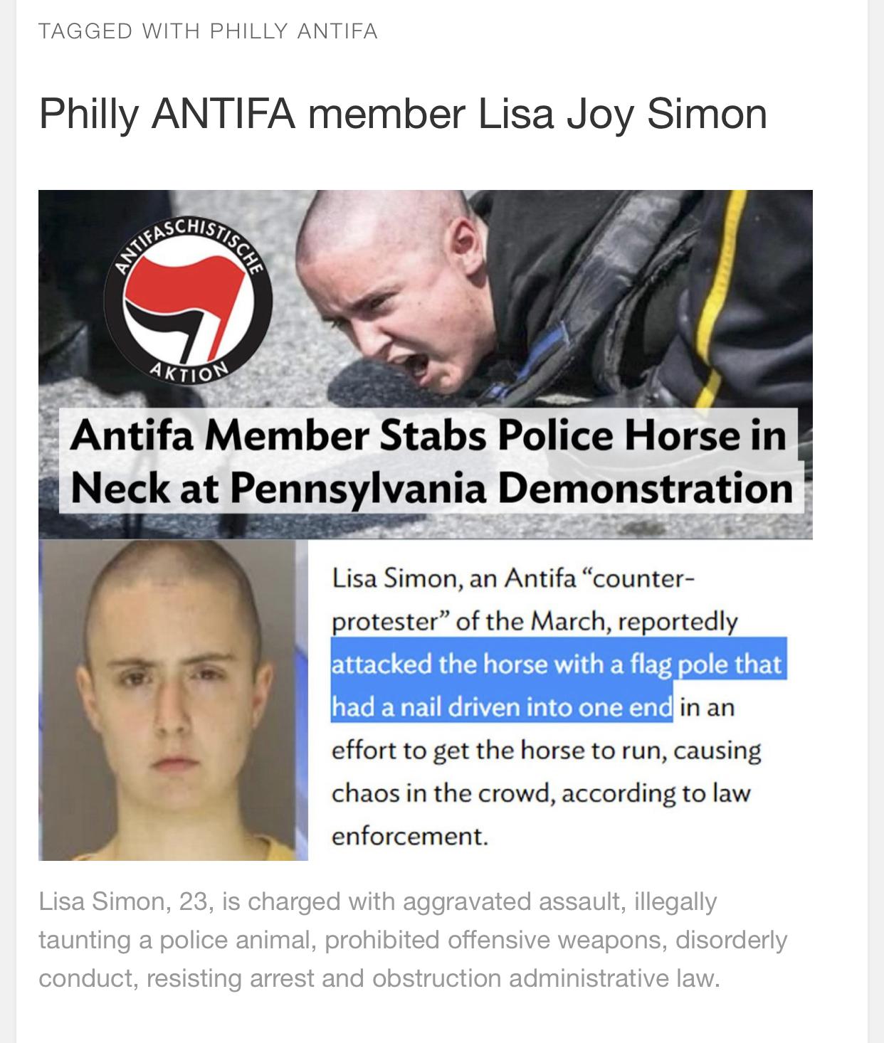 Attacked a police horse https://www.fox43.com/article/news/local/contests/demonstrator-attacks-police-horse-during-act-for-america-rally-in-harrisburg/521-064b4082-68d5-4391-a867-e7d00221d135 Lisa Simon, 23, is charged with aggravated assault, illegally taunting a police animal, prohibited offensive weapons, disorderly conduct, resisting arrest and obstruction administrative law. She was arraigned and taken to Dauphin County Prison in lieu of $100,000 bail.