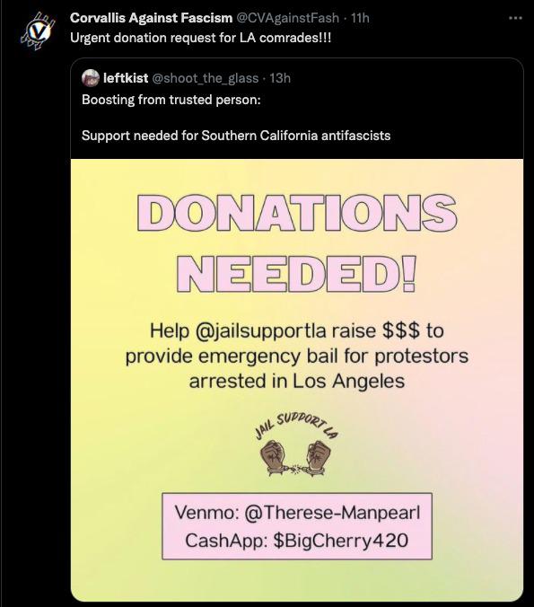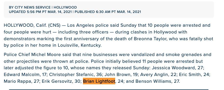 https://twitter.com/AntifaWatch2/status/1467955294139518992 https://s3.documentcloud.org/documents/21141938/pb-criminal-complaint.pdf https://www.sandiegouniontribune.com/news/public-safety/story/2021-12-04/sdpd-arrests-anti-fascists-patriot-march Arrested as a part of an alleged criminal conspiracy to riot and assault people during a January 9th 2021 Patriot March in San Diego Brian Lightfoot - arrested March Breonna Taylor riot for prohibited item (likely a knife/OC) https://archive.ph/A5X9h
