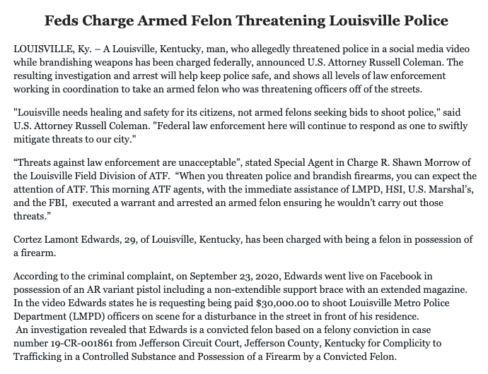 https://www.justice.gov/usao-wdky/pr/feds-charge-armed-felon-threatening-louisville-police https://www.wlky.com/article/29-year-old-man-charged-with-threatening-to-shoot-lmpd-officers-while-on-facebook-live/34183749 Cortez Lamont Edwards, 29, of Louisville, Kentucky, has been charged with being a felon in possession of a firearm. Edwards states he is requesting being paid $30,000.00 to shoot Louisville Metro Police Department (LMPD) officers on scene for a disturbance in the street in front of his residence https://www.courtlistener.com/docket/18479479/united-states-v-edwards/
