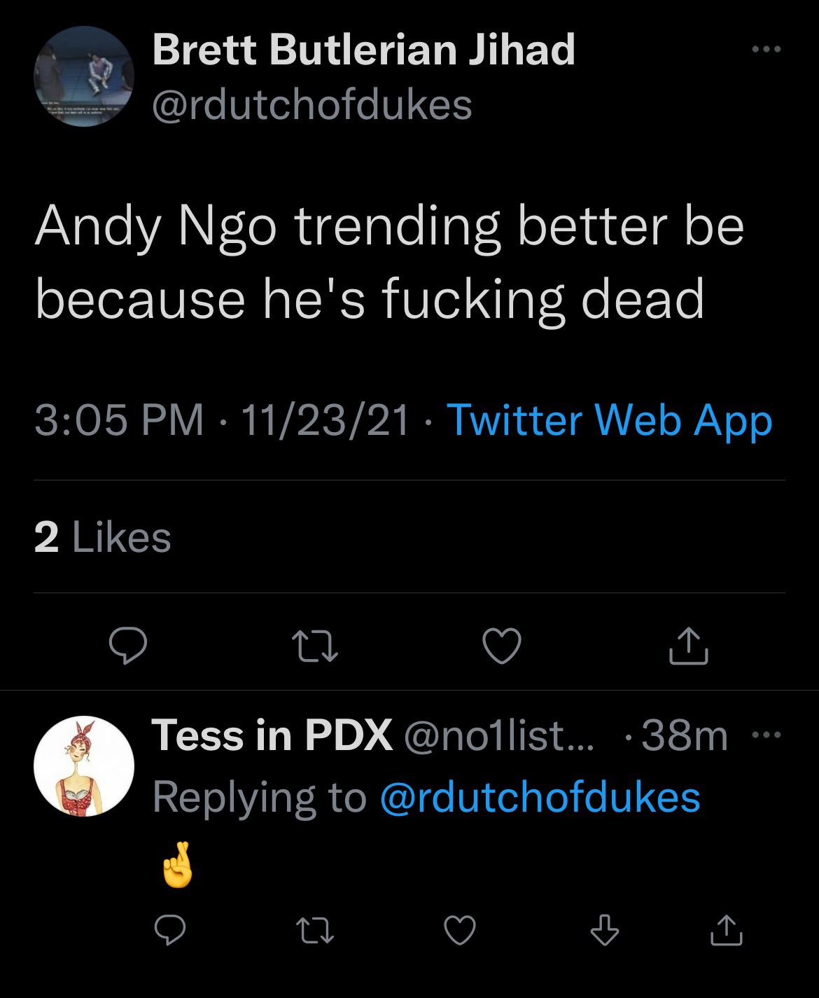 Writing under a moniker, Jesse Stutzman, who works for @MarkelSmallBiz in Las Vegas, tweeted: "Andy Ngo trending better be because he's f—ng dead." Sorry to disappoint. http://archive.ph/BSe0b