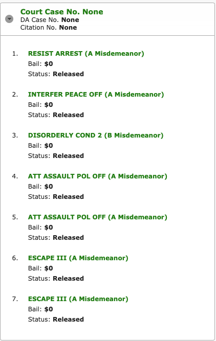 http://www.mcso.us/PAID/Home/Booking/1506287 RESIST ARREST (A Misdemeanor) INTERFER PEACE OFF (A Misdemeanor) DISORDERLY COND 2 (B Misdemeanor) ATT ASSAULT POL OFF (A Misdemeanor) ATT ASSAULT POL OFF (A Misdemeanor) ESCAPE III (A Misdemeanor) ESCAPE III (A Misdemeanor)