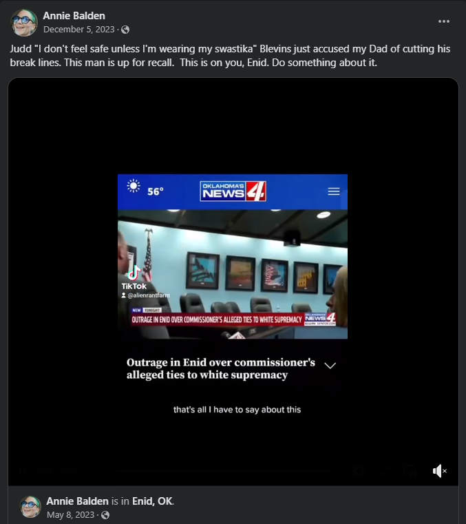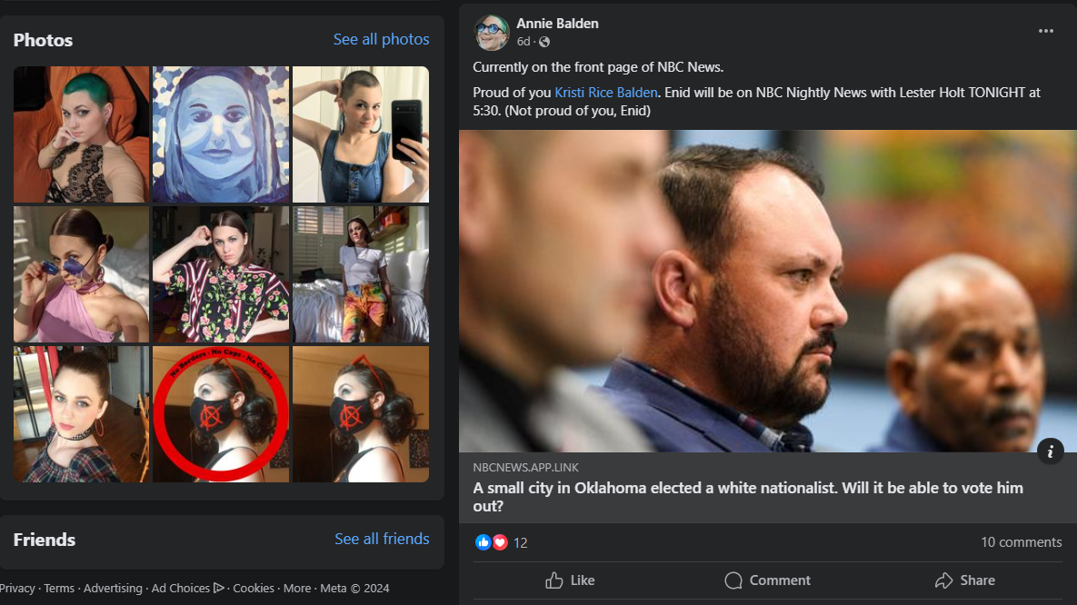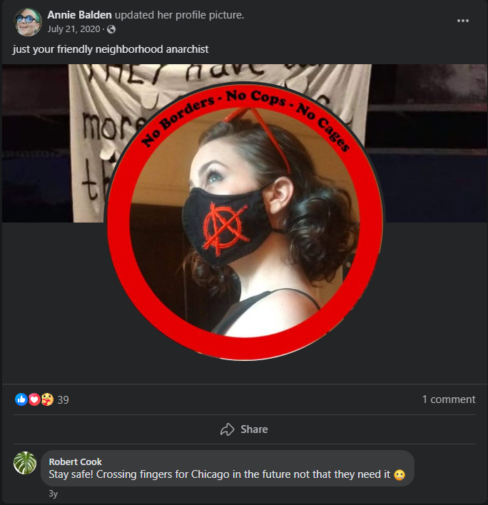 Annamarie Balden is a Chicago-based antifascist and member of the Enid Social Justice Committee, an Oklahoma-based Antifa cell dedicated to unseating a conservative politician who marched at Cville. She is the daughter of Kristi Rice Balden, the group’s chairwoman. Byron Balden, her father, was alleged to have attempted to cut a conservative politician's break lines, but it was never confirmed. On Facebook, she has described herself as a "friendly neighborhood anarchist" and has worn a "three down arrows" covid mask. She is currently living in Chicago but has family ties to Enid, Oklahoma. https://justicereport.news/2024/03/21/antifa-and-media-are-subverting-democracy-in-enid-oklahoma/