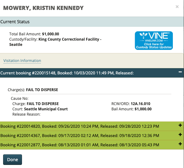 https://omny.fm/shows/the-jason-rantz-show/seattle-protester-kristin-mowery-takes-issue-with https://twitter.com/jasonrantz/status/1291917984529657856?lang=en https://www.independent.co.uk/news/world/americas/seattle-protests-chop-federal-agents-trump-riot-arrests-latest-a9639176.html Charge: PED INTERFERENCE 9/26 seattle previously charged with Charge: OBSTRUCTION/PROTEST on 9/17 and INV ASSAULT POLICE on 8/13