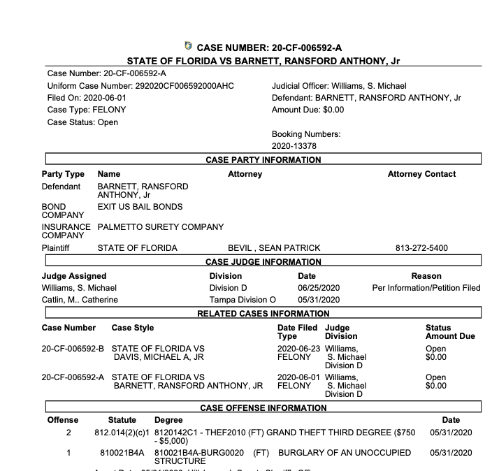 BARNETT, RANSFORD ANTHONY JR 3/23/94 GRAND THEFT THIRD DEGREE ($750- $5,000)' BURGLARY OF AN UNOCCUPIED STRUCTURE