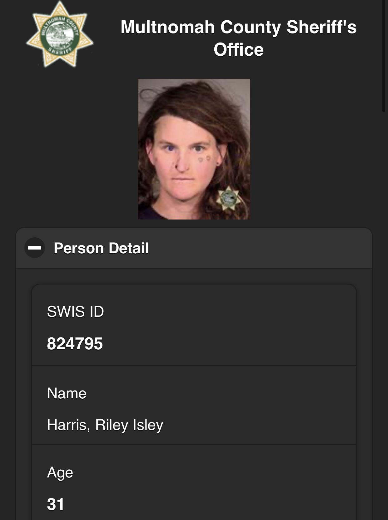 Riley Isley Harris, formerly known as Timothy Michael Harris, is charged w/multiple offenses in relation to the #antifa riot in north Portland. The 31-year-old transsexual was previously charged w/felony assault at another violent protest last month. http://archive.vn/yPsFm
