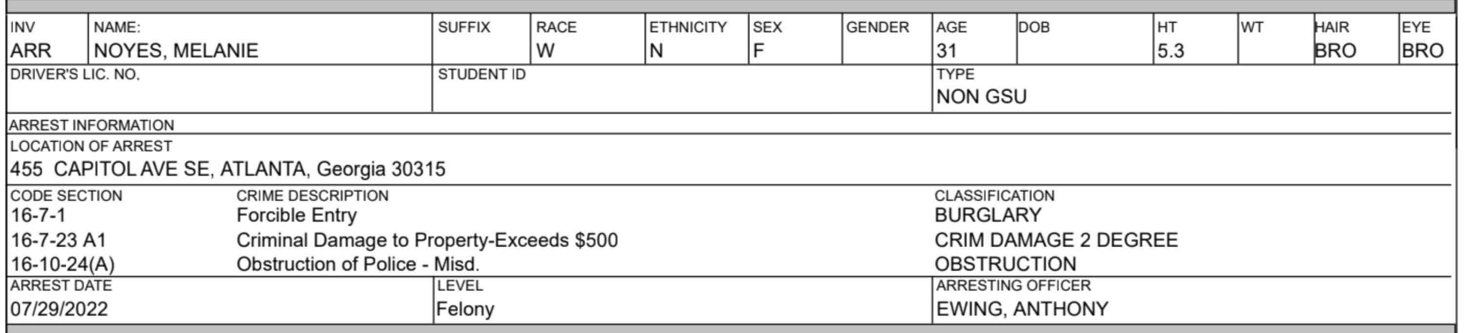 Malanie Noyes was arrested with several others on July 29, 2022 for attacking a construction site of Brasfield & Gorrie at Georgia State University. The attack was part of the #StopCopCity and Defend the Atlanta Forest campaign. Incident Report https://wmkinstitute.com/police-incident-report-seven-arrested-for-property-destruction-at-georgia-state-university/ Full name: Melanie Nadine Noyes, (born Feb. '91). Noyes is co-owner of a marijuana products company with Asheville Anti-Racism and Redneck Revolt member Taylon Breeden (https://antifawatch.net/ViewReport/fc75bdc2). Noyes is from El Salvador originally but lives in Asheville. She shilled for money to send her mother and grandmother back to El Salvador and said that people who voted for Ronald Reagan should foot the bill. She seems to be fairly active in local politics, speaking at city meetings and such. https://simplyextract.com/meet-the-simply-team/ https://archive.ph/ltF15