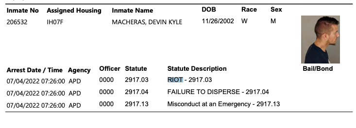 Arrested during Akron BLM riots. Arrest Date / Time Agency Officer Statute Statute Description Bail/Bond 07/04/2022 07:26:00 APD 0000 2917.03 RIOT - 2917.03 07/04/2022 07:26:00 APD 0000 2917.04 FAILURE TO DISPERSE - 2917.04 07/04/2022 07:26:00 APD 0000 2917.13 Misconduct at an Emergency - 2917.13