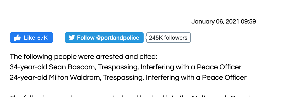 https://www.portlandoregon.gov/police/news/read.cfm?id=281449 34-year-old Sean Bascom, Trespassing, Interfering with a Peace Officer https://twitter.com/MrAndyNgo/status/1346894602930966531/photo/2