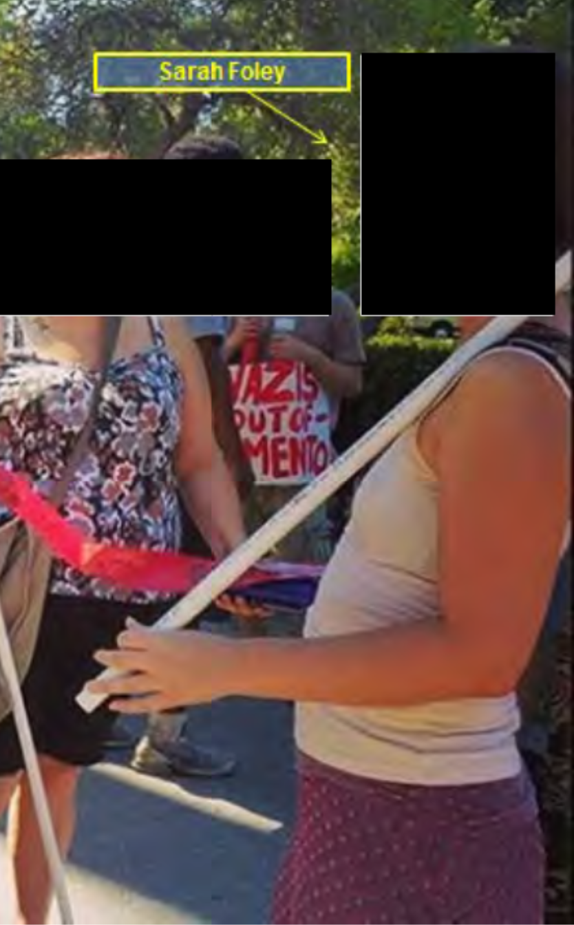 According to a 2016 criminal investigation by the California Highway Patrol recently obtained by the William McKinley Institute, Sarah Patricia Foley "arrived at the California State Capitol to support a planned action to deny the Traditionalist Worker Party (TWP) from assembling and speaking at their event." Birthdate: 7/11/1984 https://wmkinstitute.com/chps-2000-page-report-on-2016-sacramento-capital-anti-white-antifa-terrorist-attack/ https://wmkinstitute.com/chp-helicopter-footage-of-the-2016-premeditated-anti-white-attack-in-sacramento/ https://wmkinstitute.com/the-torch-antifa-network-the-anarcho-terrorist-syndicate/