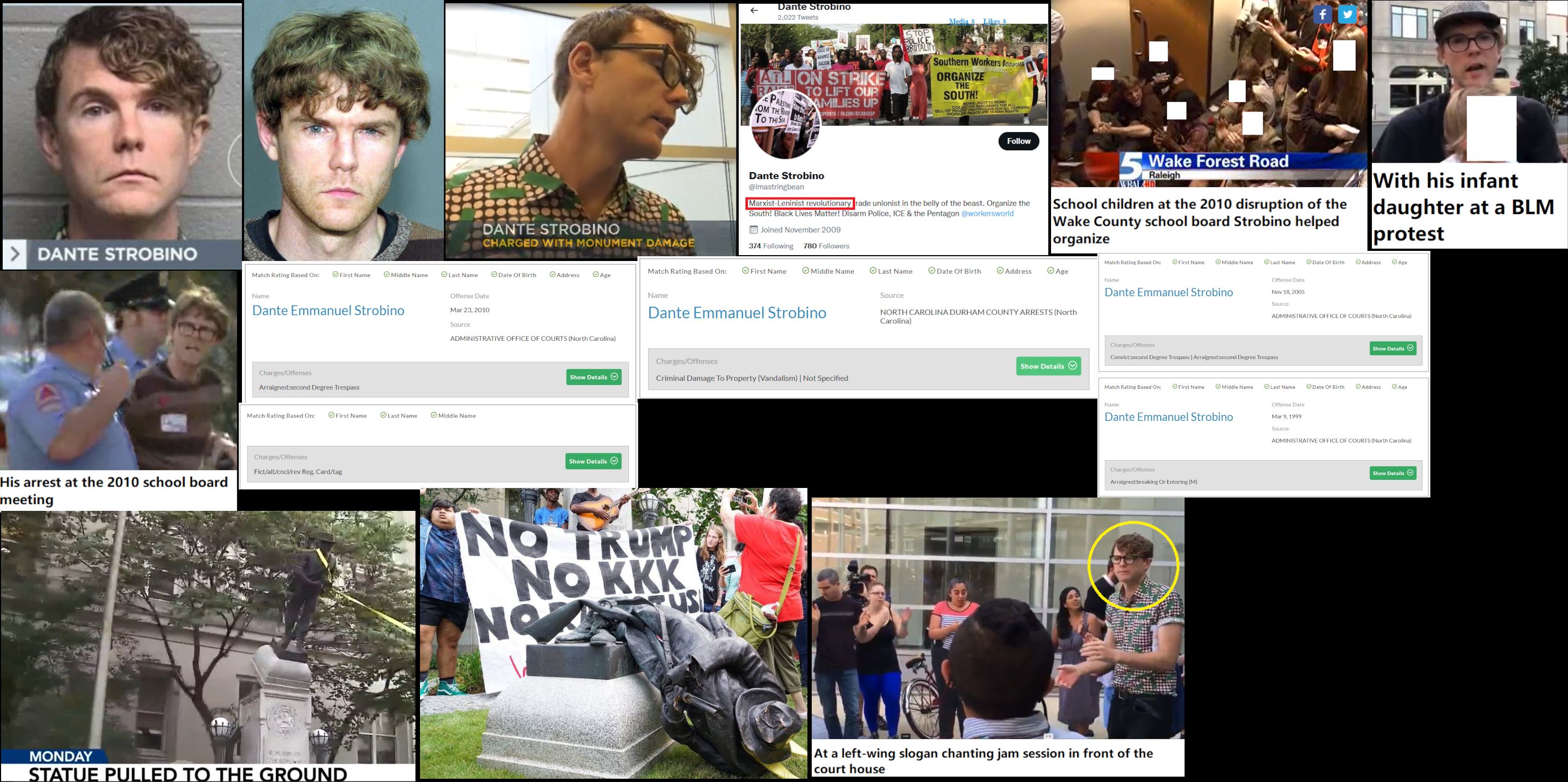 Dante Emmanueal Strobino (DOB:12/22/81) is a self-described Marxist-Leninist who was arrested at a 2010 Wake County school board meeting at a protest against ending a busing program. He was one of the organizers of the event. The protesters were mostly school children who sat down in the middle of the meeting and clapped and yelled chants. He was charged with trespassing in the incident. Strobino was arrested again in 2017 for destroying a Confederate statue in front of the Durham county courthouse. The "action" began as a vigil against "white supremacy". He was charged with participation in a riot with property damage (felony), inciting others to riot, injury to personal property, injury to real property and defacing or injuring a public monument. Unfortunately, his charges were dropped after one of the other defendants was acquitted. In June 2020, he took his infant daughter to a Durham BLM protest even though a "peaceful" protest in Durham a few days earlier turned into a violent riot. He was interviewed on camera and during the video his daughter verbalized "blah, blah, blah, blah" numerous times which is pretty much just repeating what her daddy said. He was affiliated with Fight Imperialism - Stand Together, a radical student group that appears to currently (2022) be inactive. Strobino is a field organizer for the United Electrical Radio and Machine Workers of America. He also writes columns for the Marxist Workers World website. He should ask his bosses for a raise since he makes $63K each year while organizers in the PNW make around $100K. He owns a crappy little house in Durham where he lives with his SO and his toddler. https://archive.ph/GQ0Vk#selection-2433.141-2433.164, https://archive.ph/9e7Bg, https://archive.ph/Gvd44#selection-1551.0-1551.14, https://archive.ph/liq2Q https://twitter.com/i/status/1269055541491400704 https://www.linkedin.com/in/dante-strobino-40a22a24?original_referer=