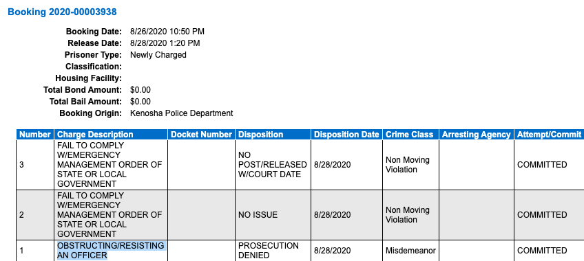 http://inmate.kenoshajs.org/NewWorld.InmateInquiry/kenosha/Inmate/Detail/-597707 FAIL TO COMPLY W/EMERGENCY MANAGEMENT ORDER OF STATE OR LOCAL GOVERNMENT OBSTRUCTING/RESISTING AN OFFICER Schwartz lives in Milwaukee. DOB: 4/27/84