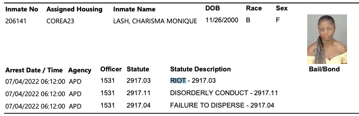 Arrested during Akron BLM riots. Arrest Date / Time Agency Officer Statute Statute Description Bail/Bond 07/04/2022 06:12:00 APD 1531 2917.03 RIOT - 2917.03 07/04/2022 06:12:00 APD 1531 2917.11 DISORDERLY CONDUCT - 2917.11 07/04/2022 06:12:00 APD 1531 2917.04 FAILURE TO DISPERSE - 2917.04